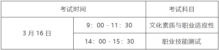 总分450分。其中文化素质以中学(普高、职高、技校、中专)所学知识为基础,考察学生的语文、数学,分值200分;职业适应性考察学生思想道德素质、科学素质、计算机应用基础、基本常识等方面的能力,分值250分。考试时长:150分钟。