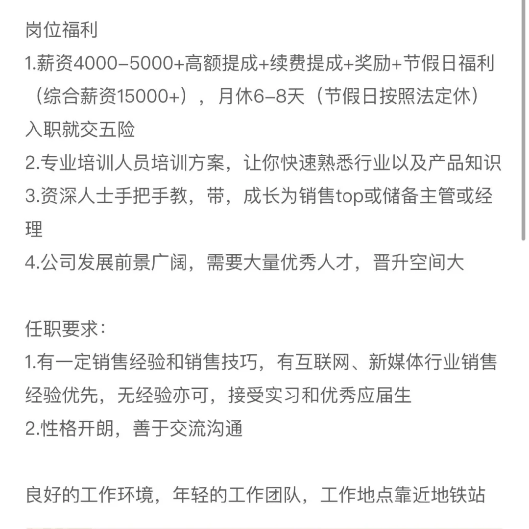 1.薪资4000-5000+高额提成+续费提成+奖励+节假日福利(综合薪资15000+),月休6-8天(节假日按照法定休)入职就交五险