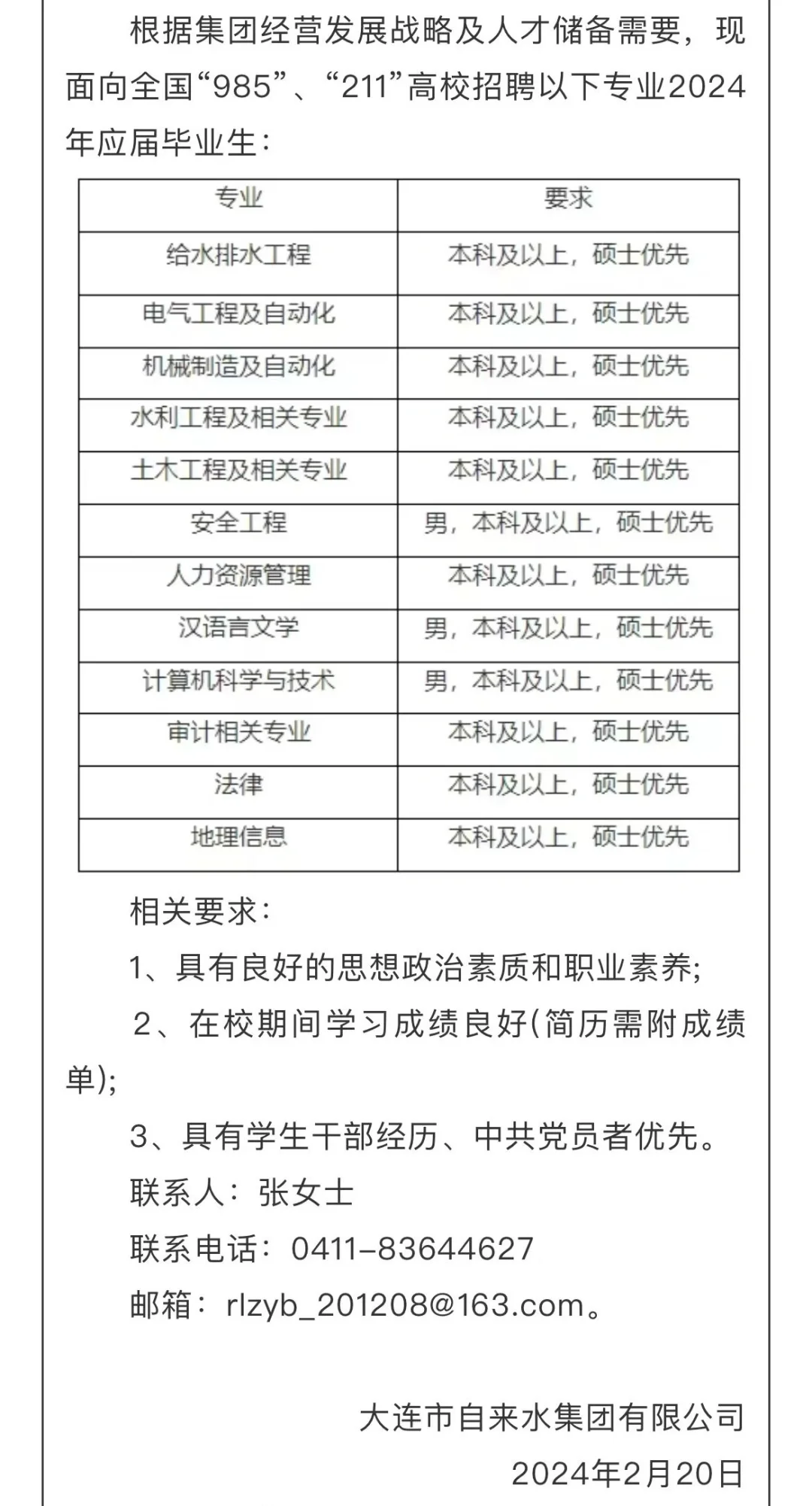 大连自来水集团招聘公告