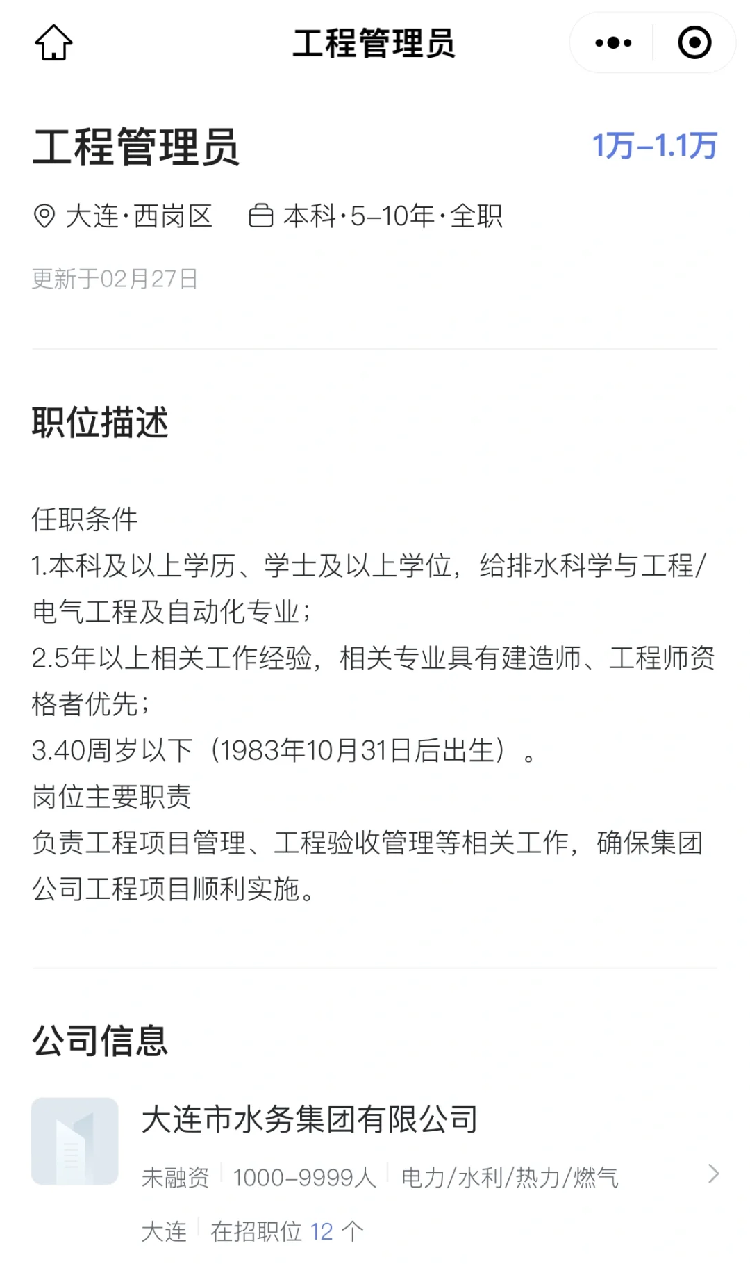 >大连自来水集团招聘公告