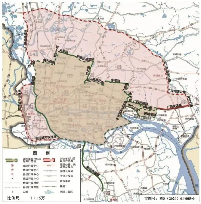 (一)市中心区:东至黄埔区与增城区交界处;南至海珠区、黄埔区与番禺区交界处;西至荔湾区、白云区与佛山市交界处;北至北环高速公路(珠江至增槎路)、增槎路(北环高速公路至西槎路)、西槎路(增槎路至石潭路)、石潭路、大冈街(石沙公路至黄石西路)、黄石西路、黄石东路、白云大道北(黄石东路至同泰路)、同泰路、同和路(同泰路至同宝路)、同宝路、沙太路(同宝路至中成路)、中成路、中元路、上元岗东头岗一巷、下元岗东大街、天源路(下元岗东大街至广汕路)、广汕路(天源路至开创大道)、开创大道(广汕公路至广深高速公路)、广深高速公路(开创大道以东)。