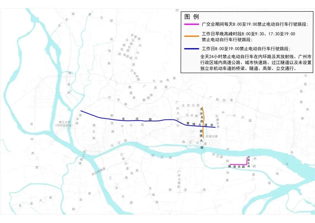 3、举办中国进出口商品交易会期间,每天8时至19时禁止电动自行车在新港东路(会展东路至会展南一路段)、会展东路行驶。