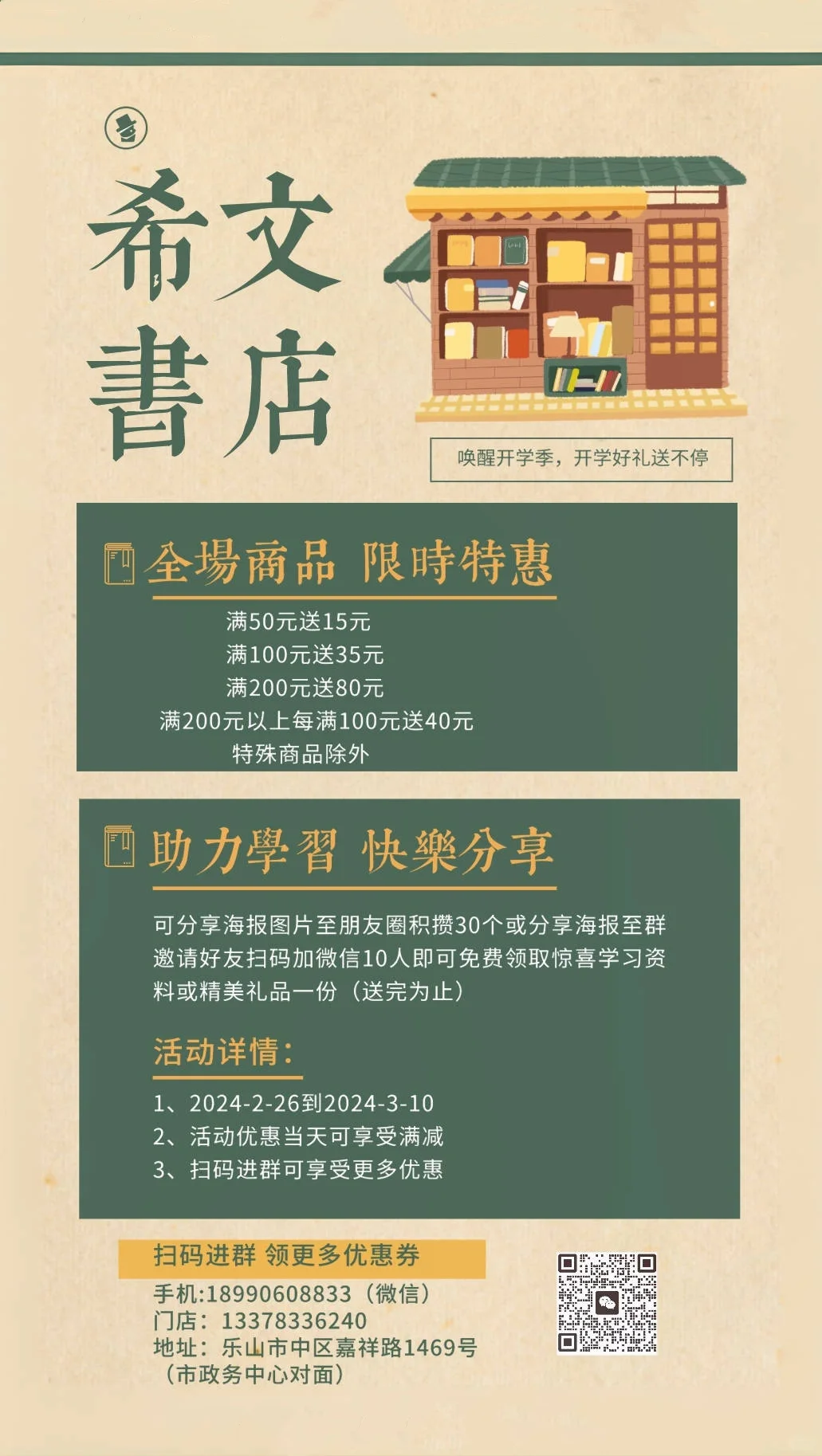 地址:乐山市市中区嘉祥路1469号希文书店(市政务中心对面)