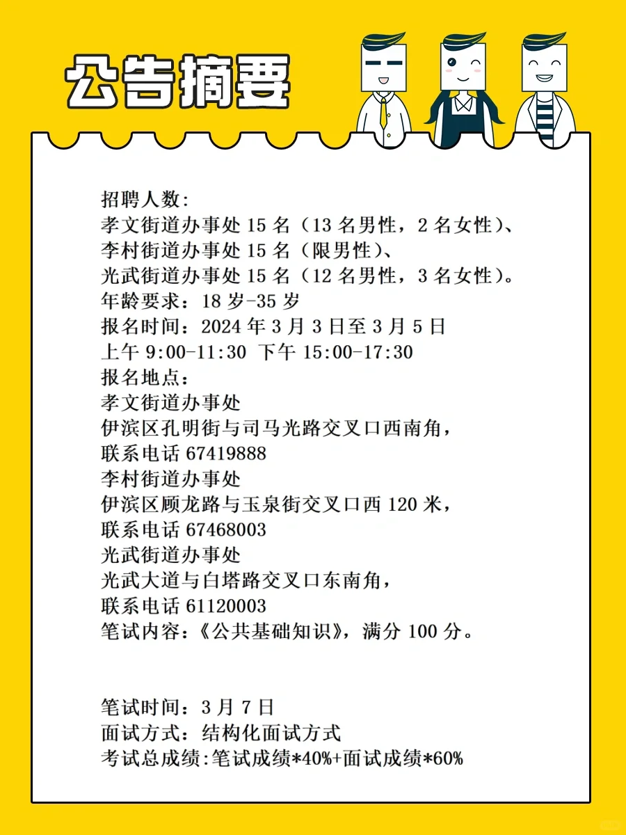 孝文街道办事处15名(13名男性,2名女性)、李村街道办事处15名(限男性)