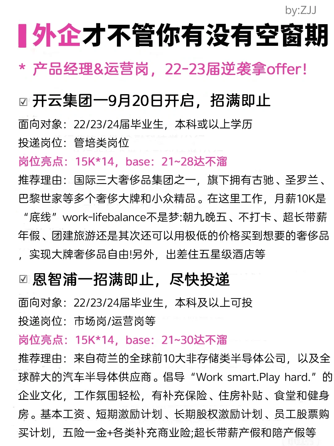 👉今年外企条件放得很开,22届/23届/24届都有机会,有1-2年工作经验的也有校招可以投递!这些企业还是很愿意招有经验的、工作时间不太久的同学,校招进外企是大家蕞容易的方式了!不要觉得外企有多高贵,遇到合适的岗位就大胆去投!