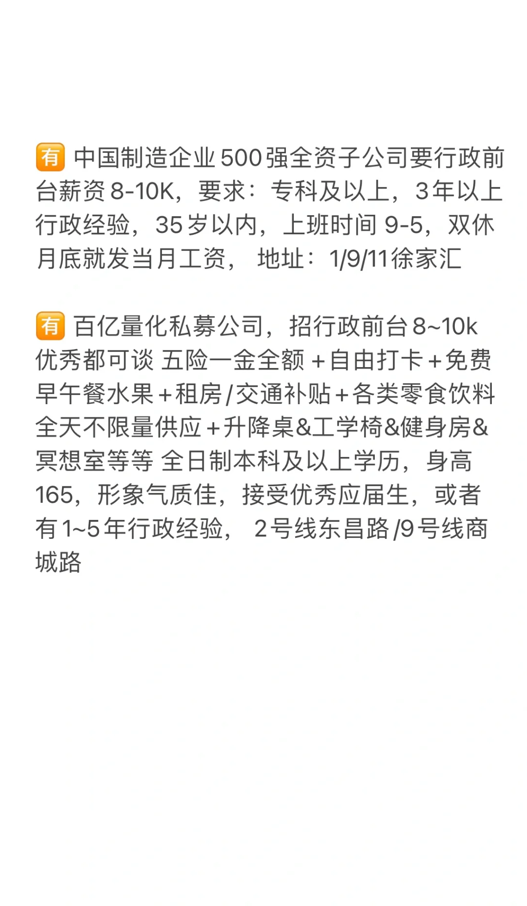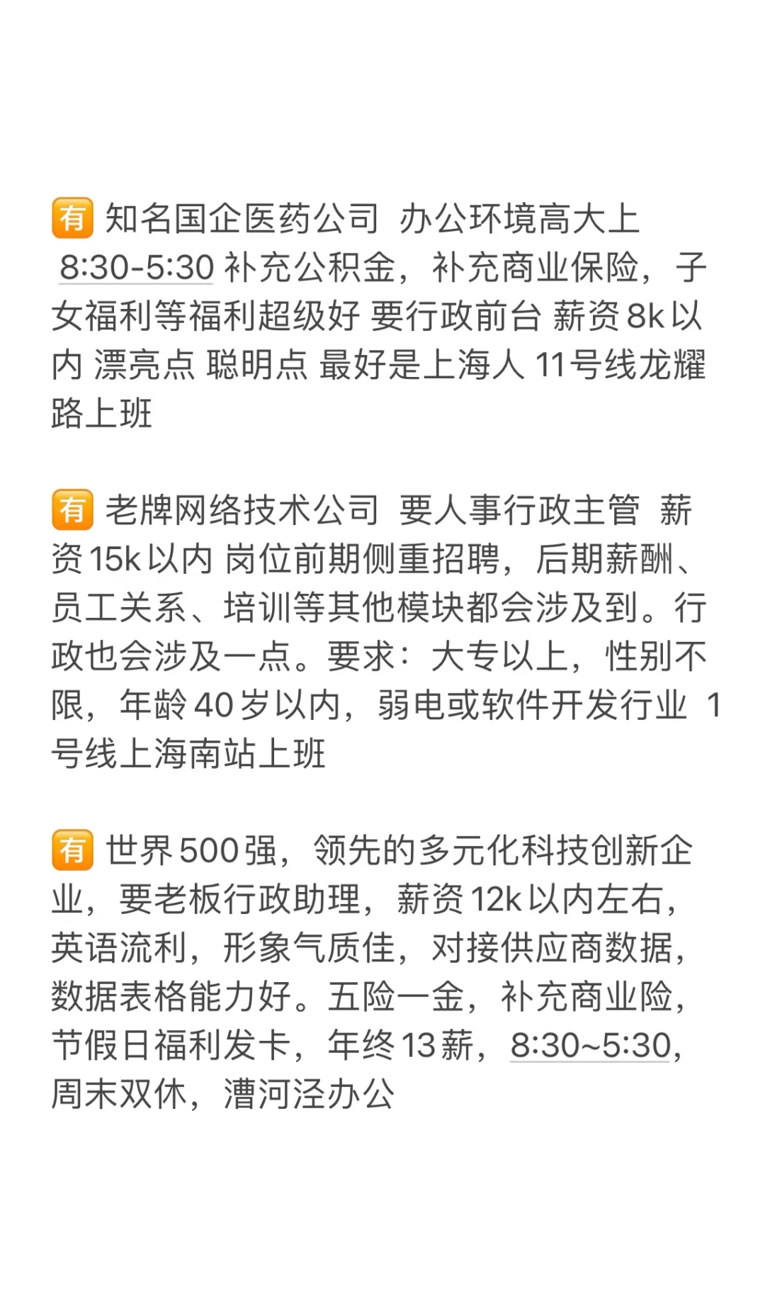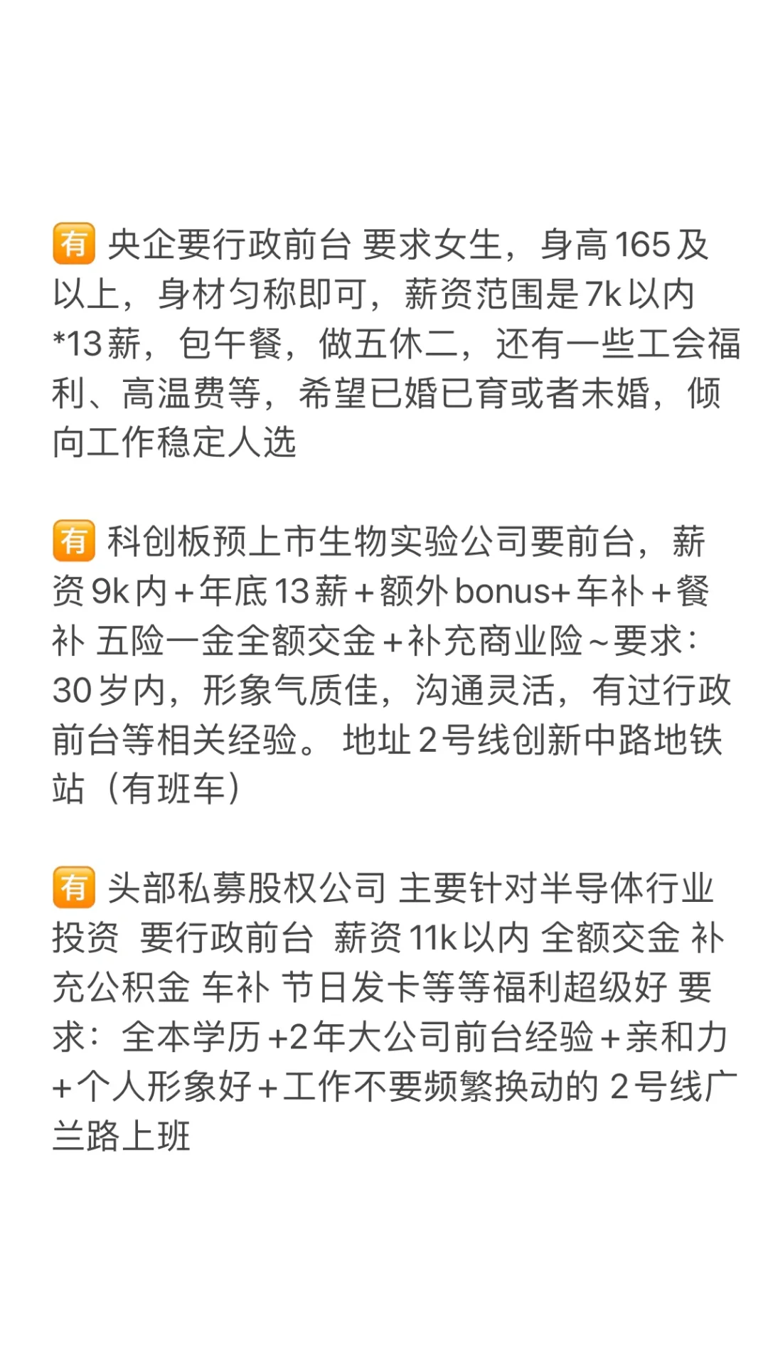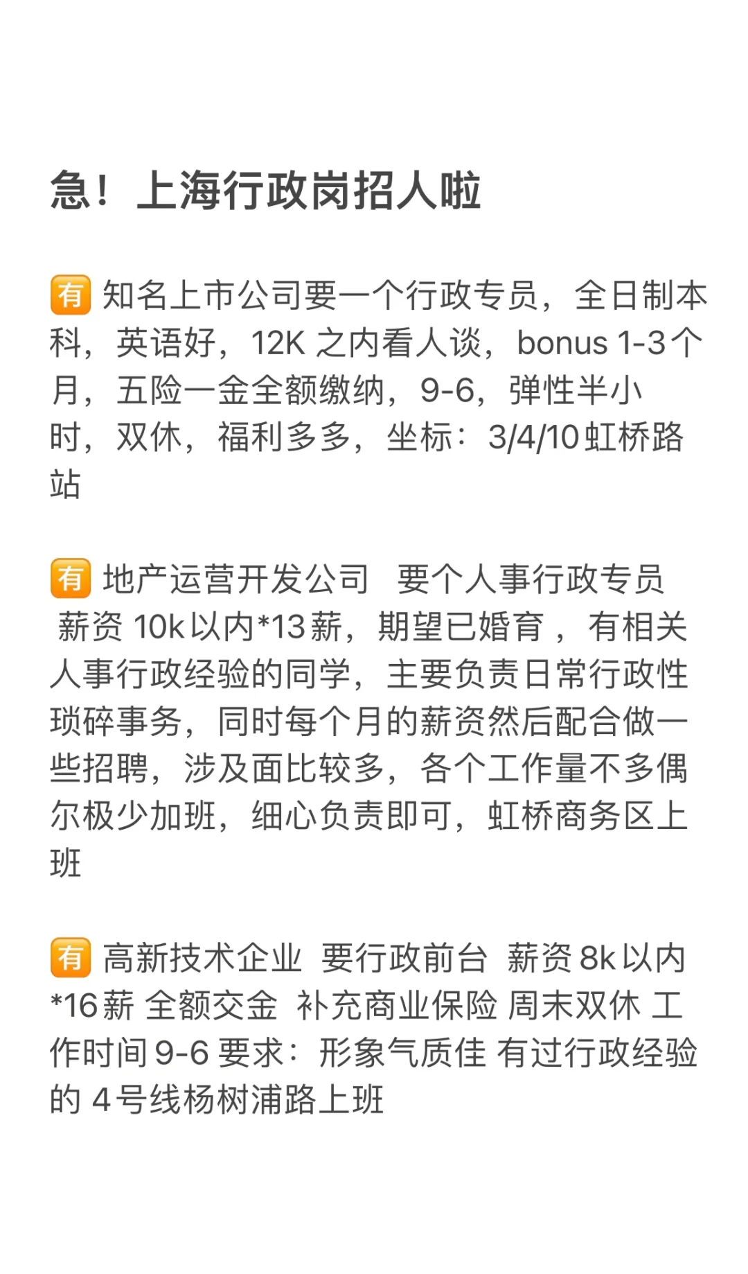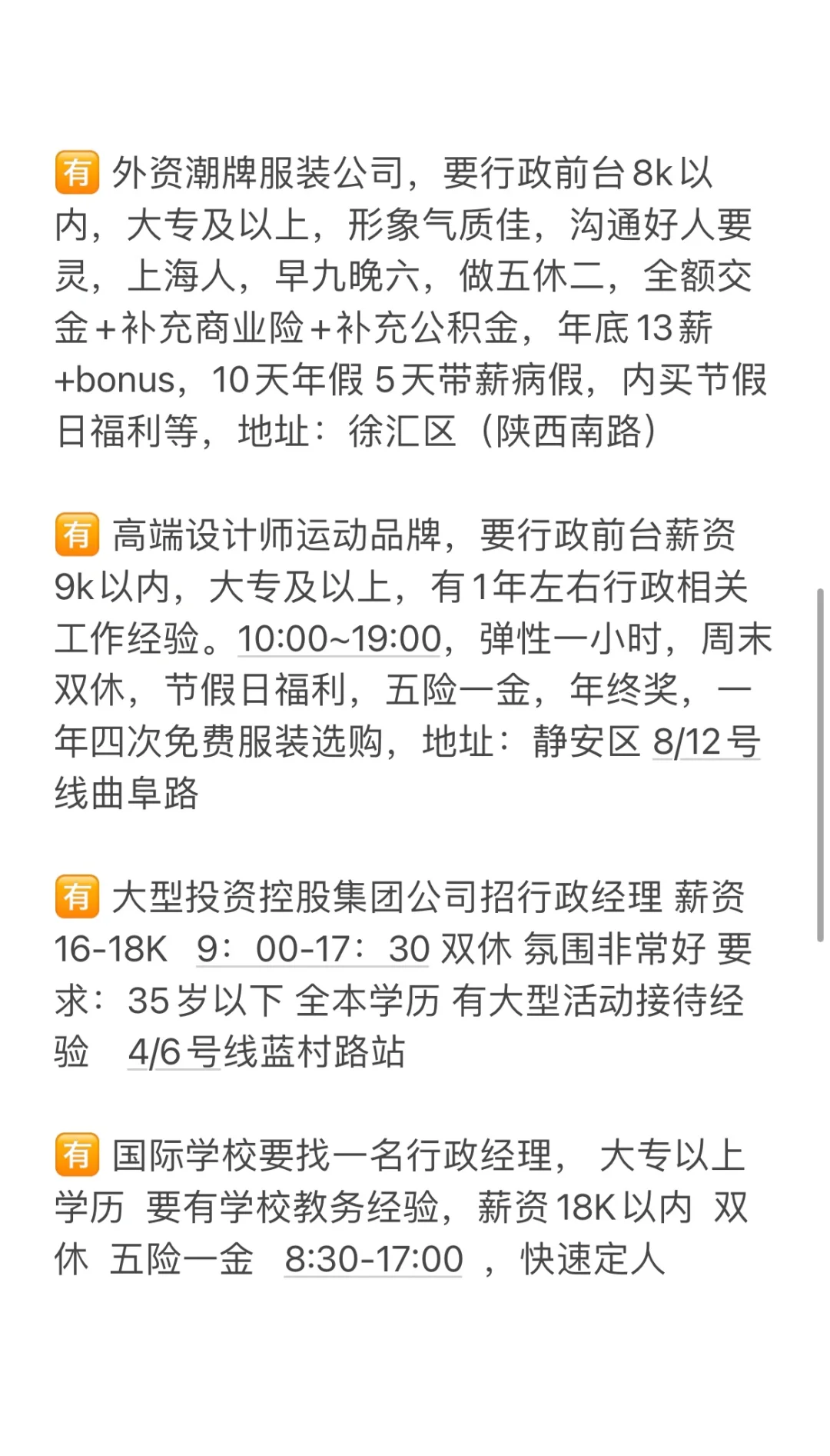 优质国企,500强公司、外企轻松不加班的行政岗合集,有需要求职是这些岗位的可以在plq回复“2.29”获取内推渠道,(每天打招呼的次数有限,不能回复评论区的所有宝子们~直接私信我更快哦)上海其他区的相关岗位岗位也都有内推名额,需要的可以后台sixin我一下。想求职具体的某家公司,也可以直接发我~~