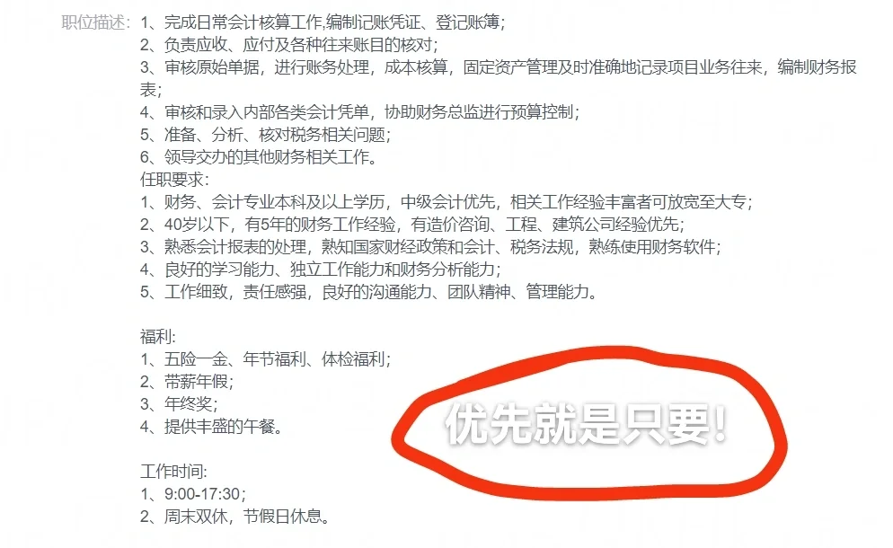 [薯券R]其实不难发现这个岗位要的是40以内,有5年建筑工程造价行业财务经验的,有中级职称的统招本科财务专业的,需要沟通能力强,财务分析能力强的人。