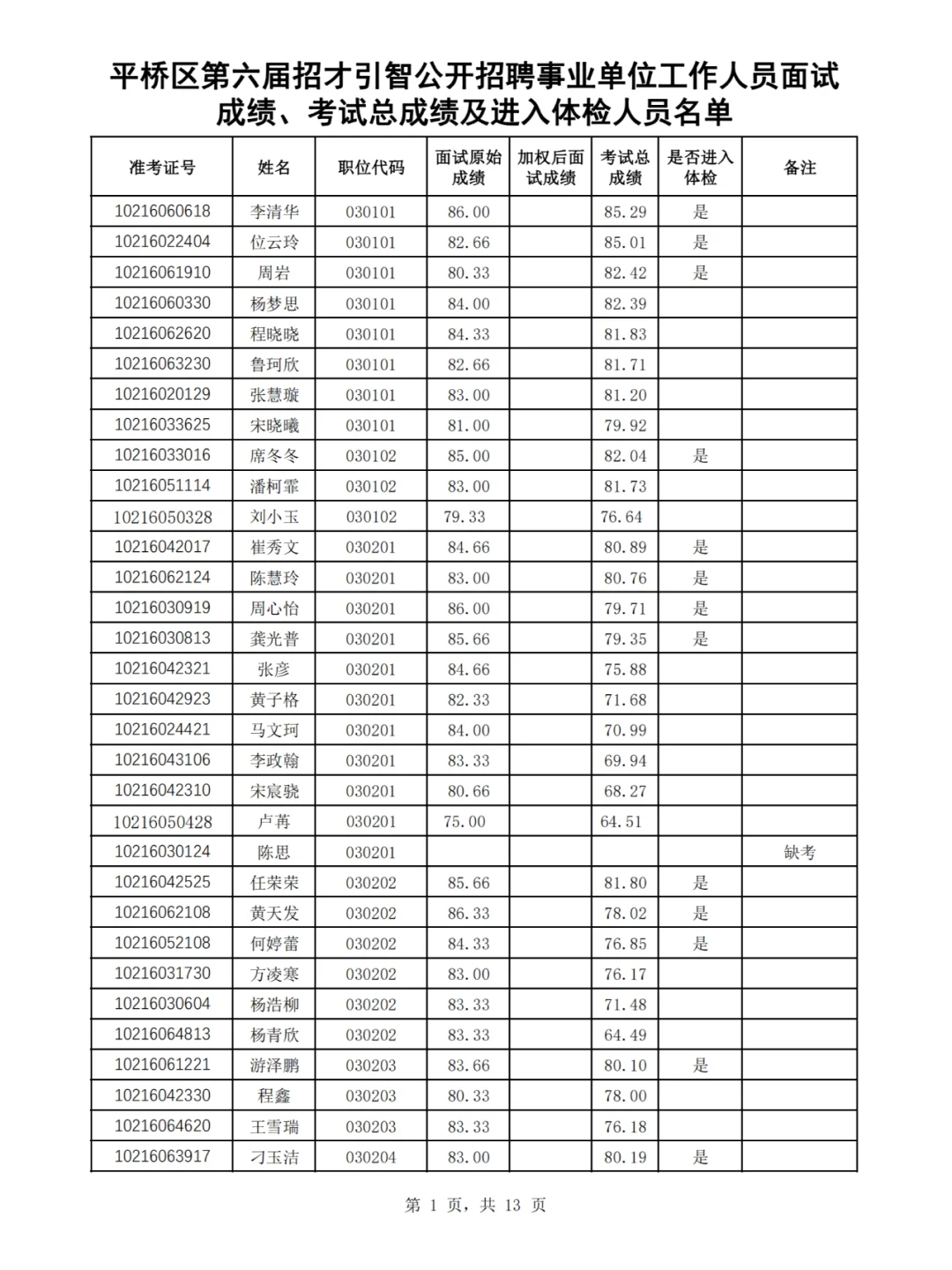 平桥区参加第六届中国·河南招才引智创新发展大会期间绿色通道公开招聘事业单位工作人员面试成绩、考试总成绩及进入体检人员公告