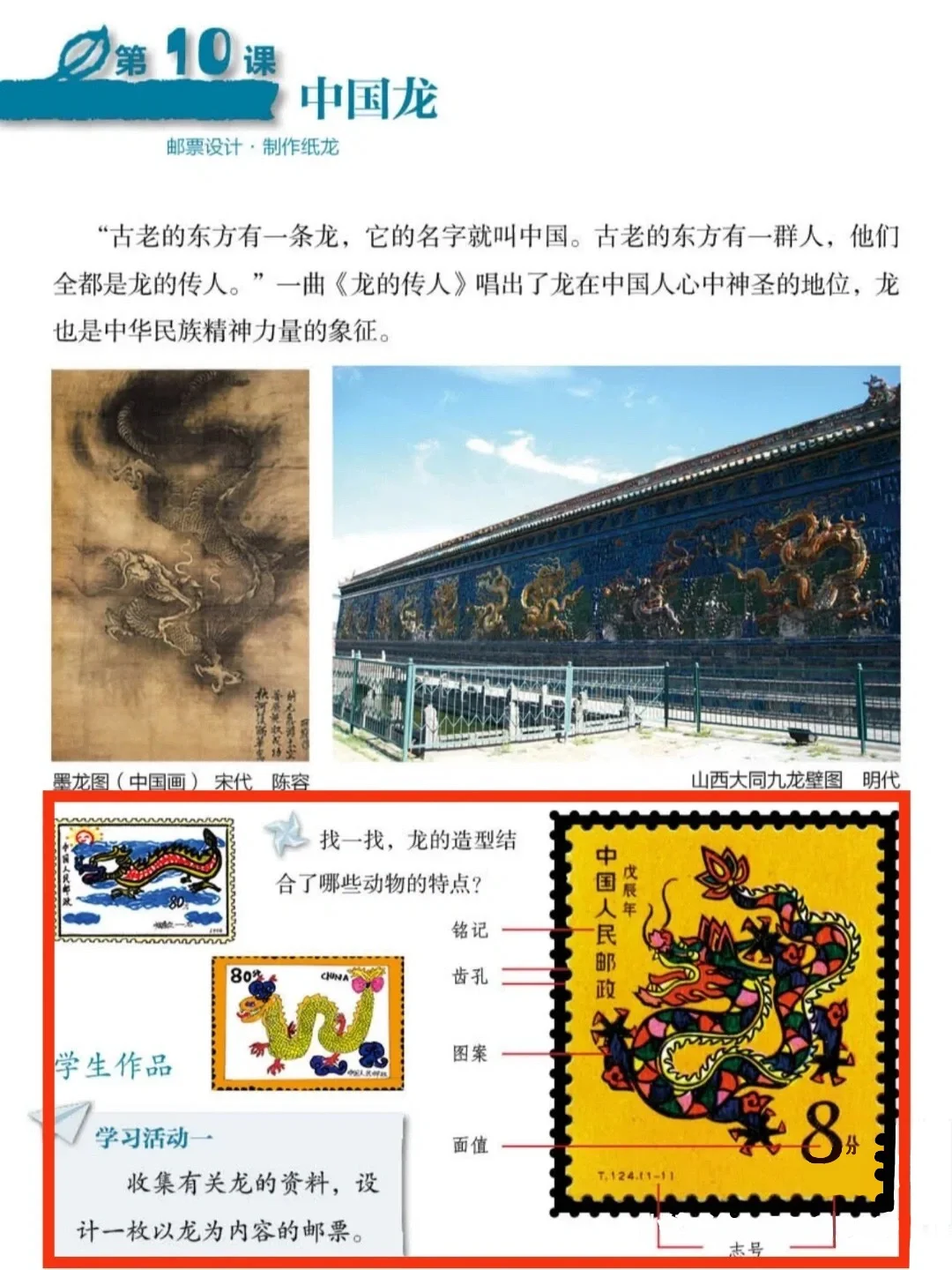 [派对R]今天更新一道23年山西特岗真题,以龙为主题设计一枚邮票,题目要求运用传统元素进行绘画。在湘美版的小学美术教材中也有对应的课程,大家也可以多关注备考地区教材内容。