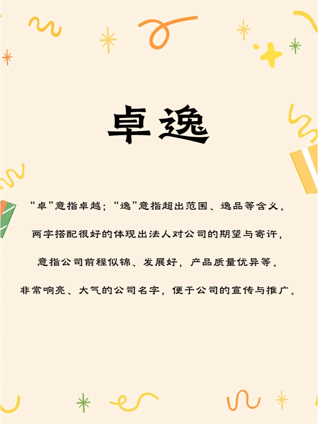 “卓”意指卓越;“逸”意指超出范围、逸品等含义。两字搭配很好的体现出法人对公司的期望与寄许,意指公司前程似锦、发展好,产品质量优异等。非常响亮、大气的公司名字,便于公司的宣传与推广。