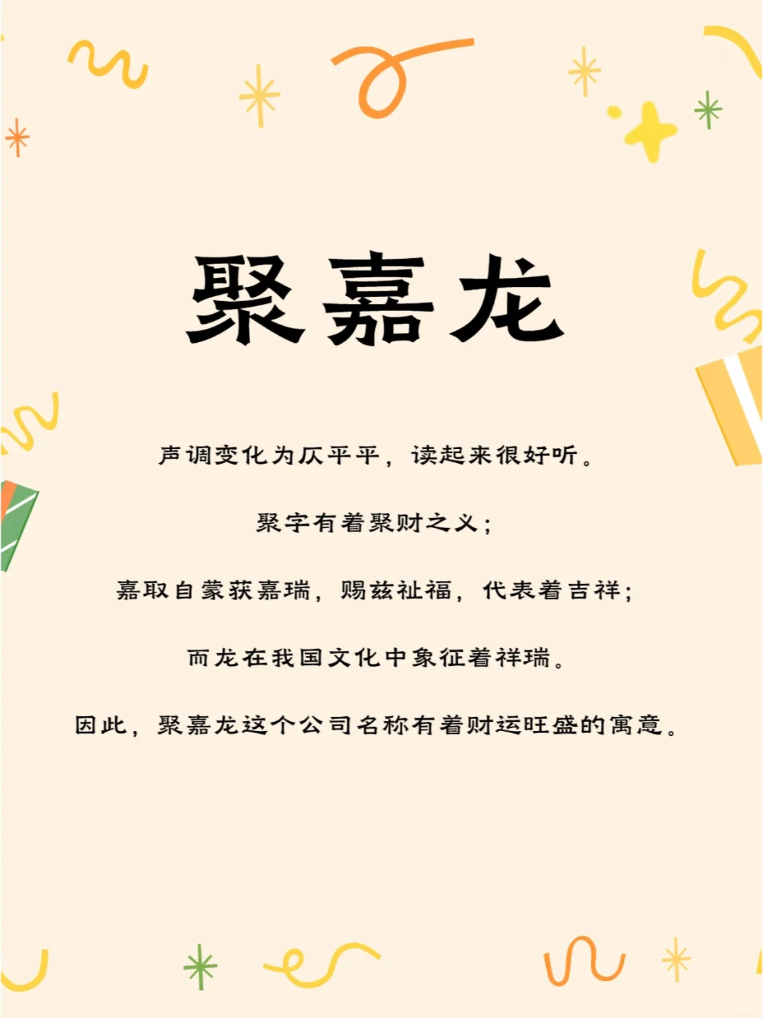 解析:给公司起名为聚嘉龙,声调变化为仄平平,读起来很好听。