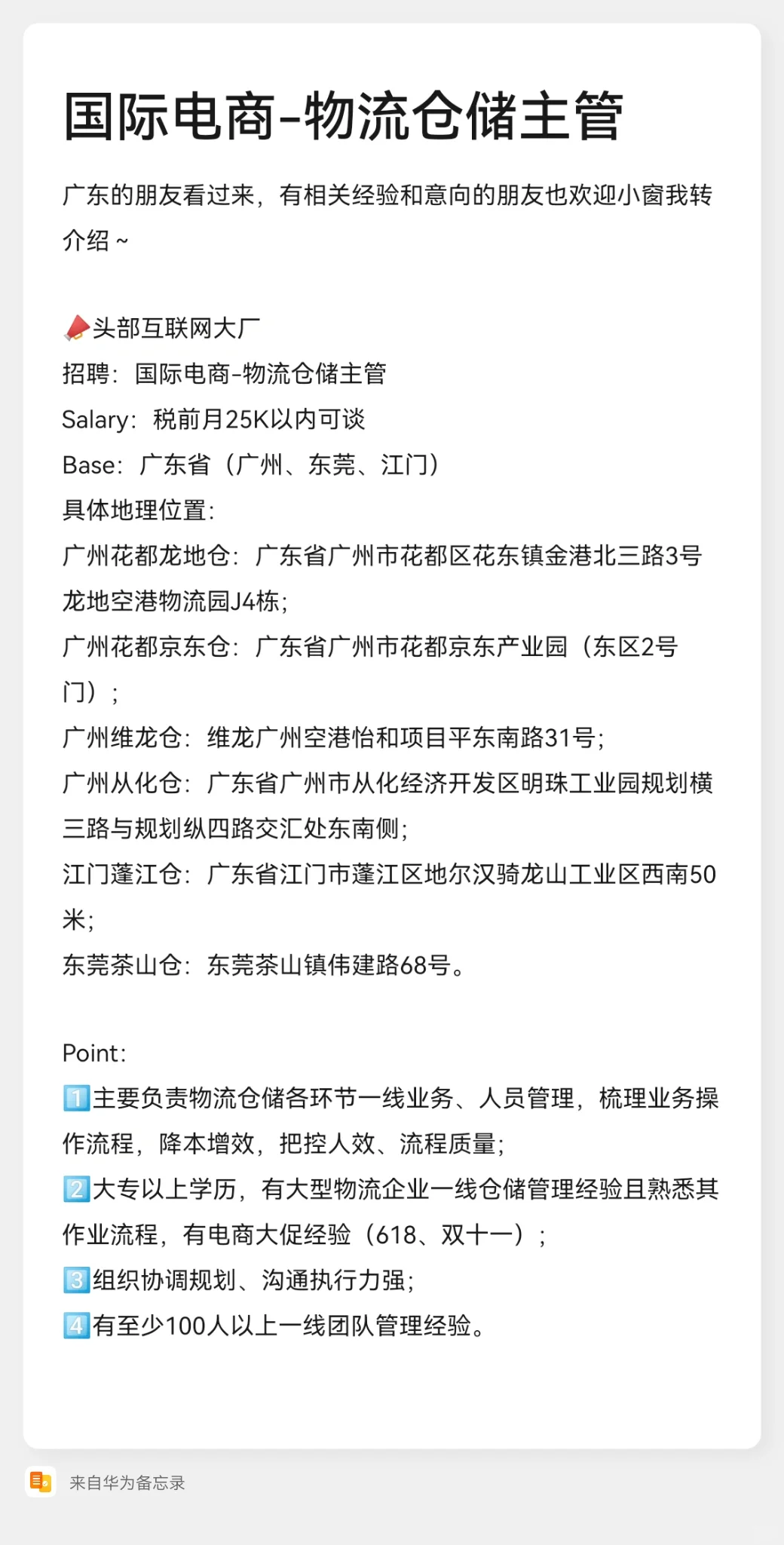 2️⃣大专以上学历,有大型物流企业一线仓储管理经验且熟悉其作业流程,有电商大促经验(618、双十一);