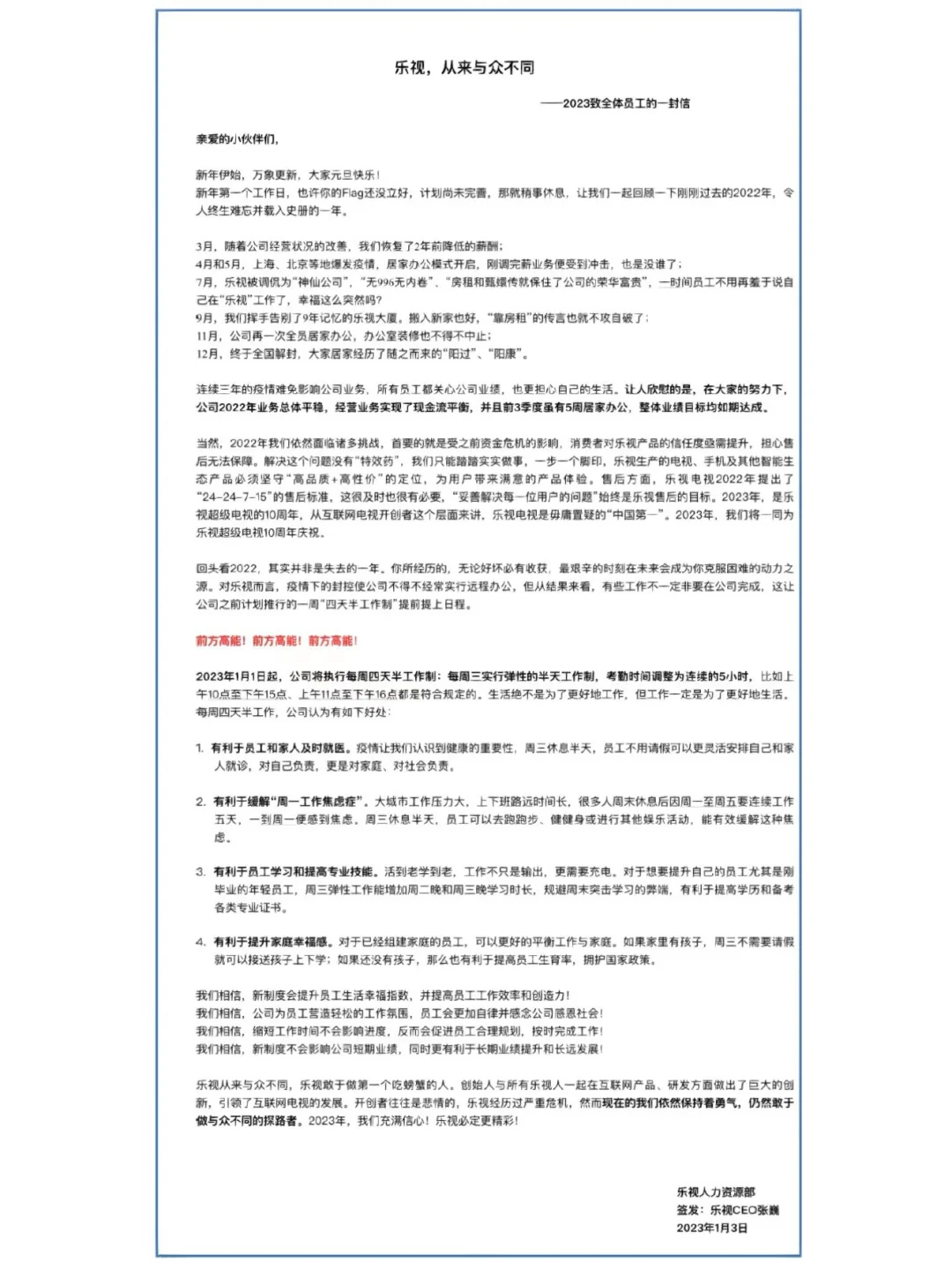乐视CEO张巍今日发布内部信,宣布自2023年1月1日起,公司将执行【每周四天半】工作制,每周三实行弹性的半天工作制,考勤时间调整为连续的5小时,比如午10点至下午15点、上午11点至下午16点都是符合规定。