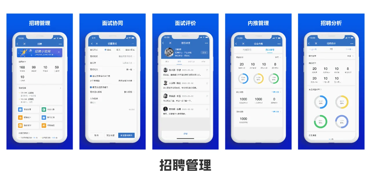 手机上就能操作邀约面试、宣传、简历筛选、分享给用人部门进行面试协同、填写面试评价内容、用内推来招人、定期统计分析出面试通过率、入职率、各个渠道的对比等等招聘所用到的