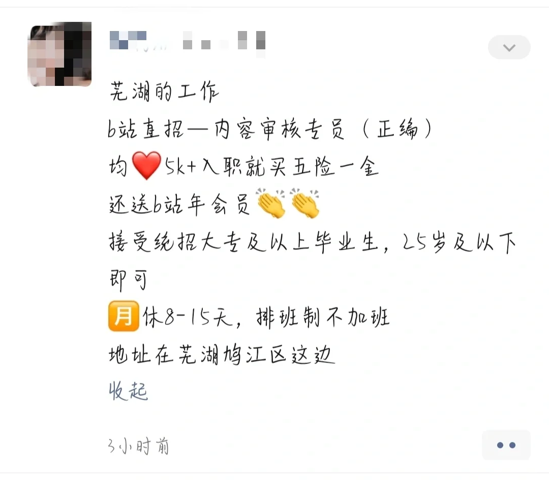去年找工作加的一个HR。她经常会在朋友圈发招聘帖,今天突然看到一个芜湖的工作,我还以为是很哇塞的工作!展开后发现哦,人家公司在芜湖。。。。。