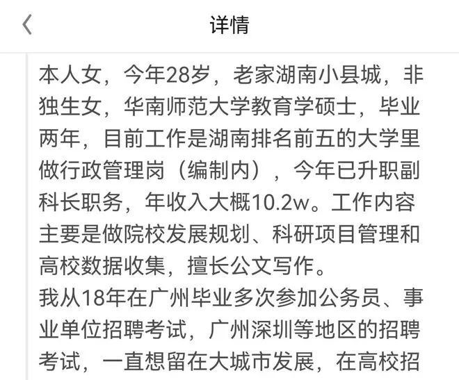 如今有些年轻人在困扰,是该留在大学的稳定工作,还是去外地打拼?就拿那些家里有弟弟的女孩来说,她们完全可以先去华南念书,然后再回家乡发展。有一个叫幽哥(音译)的小伙子最近收到了家乡小城的人才引进试招通知书。要是面试给力,通过了,那可是能拿到事业单位编制的!但这也意味着,得跟老婆坦白点事儿,包括是不是要结婚这个问题。