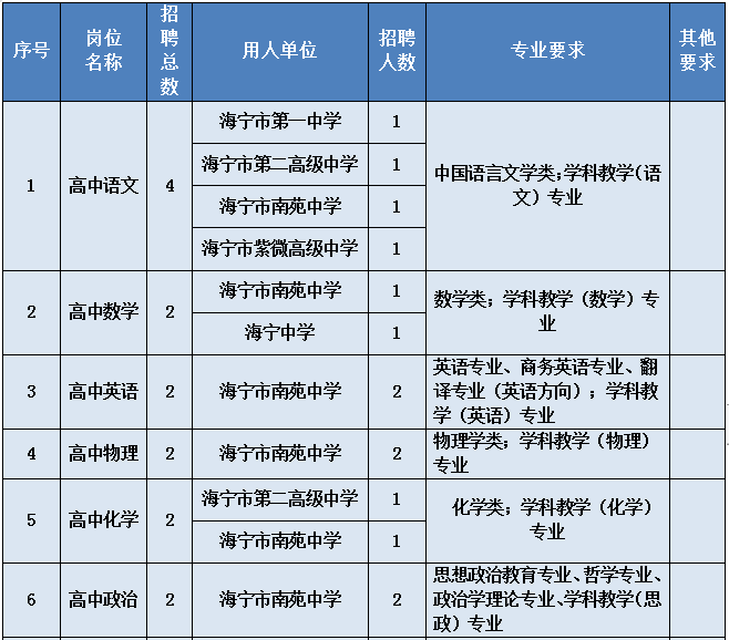 4.岗位所需专业要求:详见附件1《海宁市教育系统2024年公开招聘高中教师计划》。