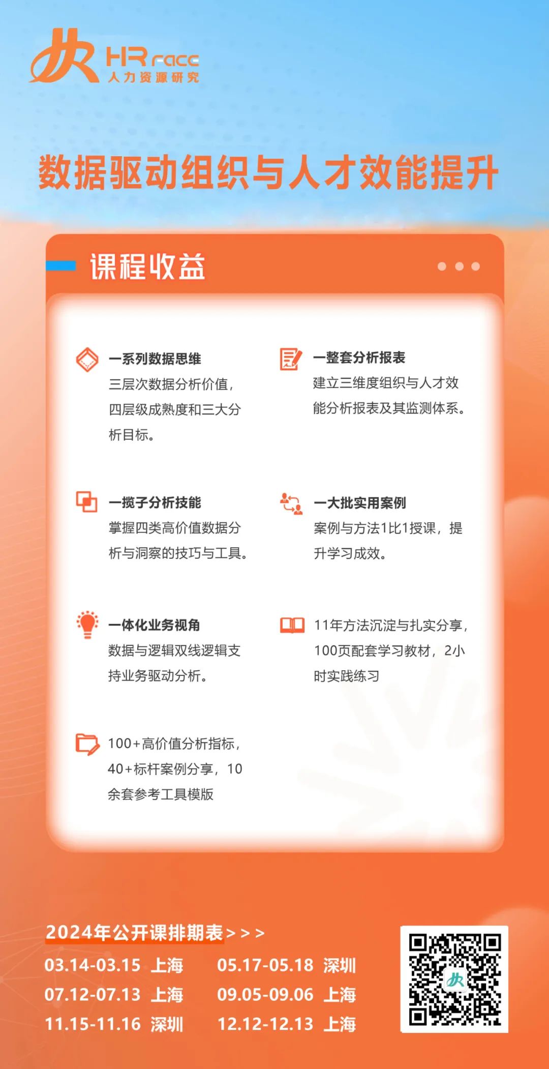 《数据驱动组织与人才效能提升》 震撼开课 该课程旨在通过数据分析与洞察,驱动业务,重塑HR价值与影响力。通过学习与咨询辅导的形式,建立组织与人才效能分析的内容体系(三纵)与方法工具(四横),基于基础要素与场景分析(基座),指向人力资源效能与价值创造的目标(顶层导向)。