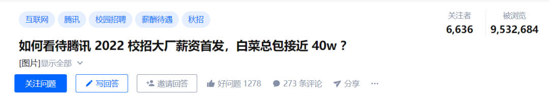 不久前,知乎有一个问题上了热搜: “如何看待腾讯2022校招大厂薪资首发,白菜总包接近40w?”