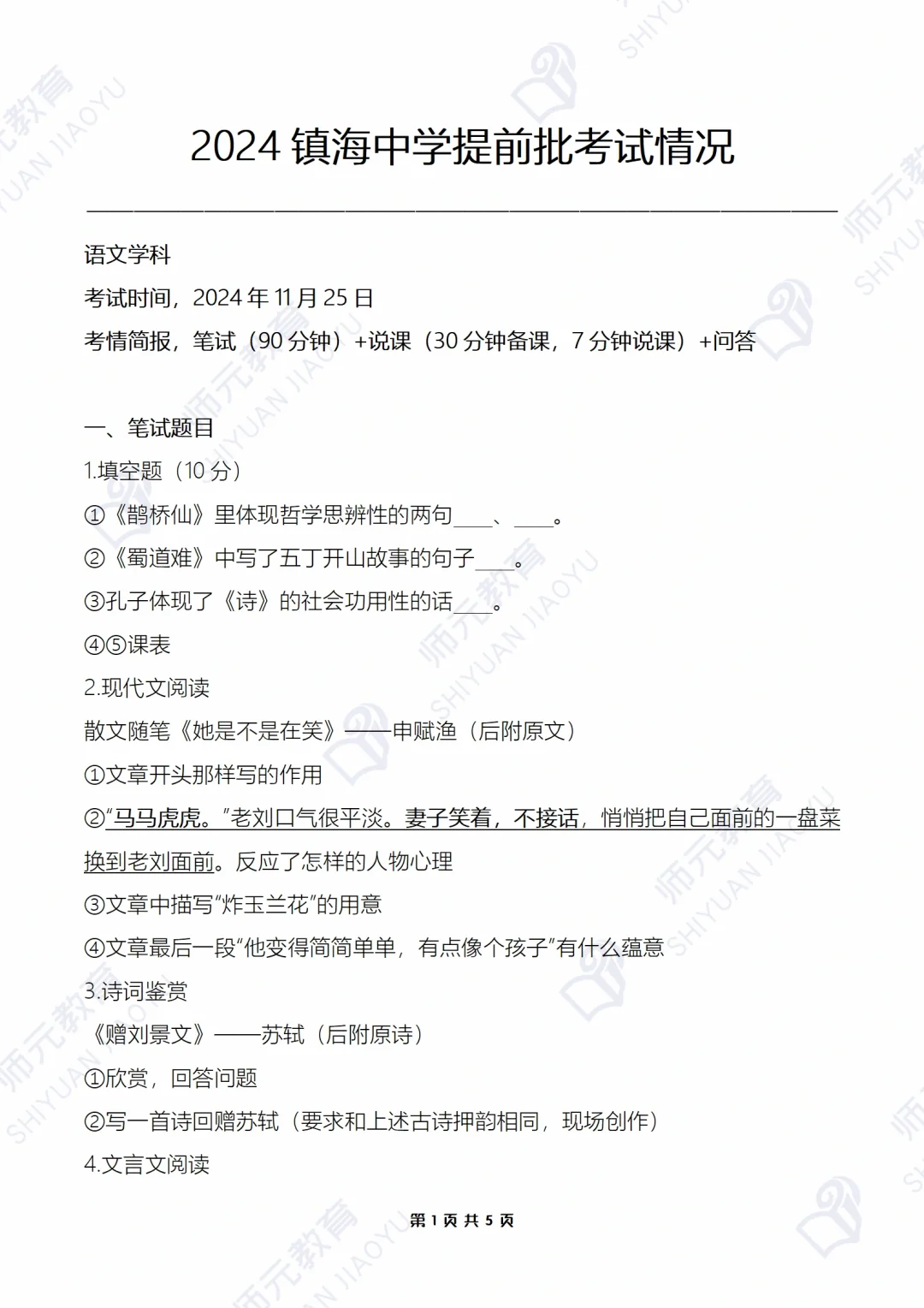 [扯脸H][扯脸H]2024镇海中学提前批语文学科于11月25日考试结束