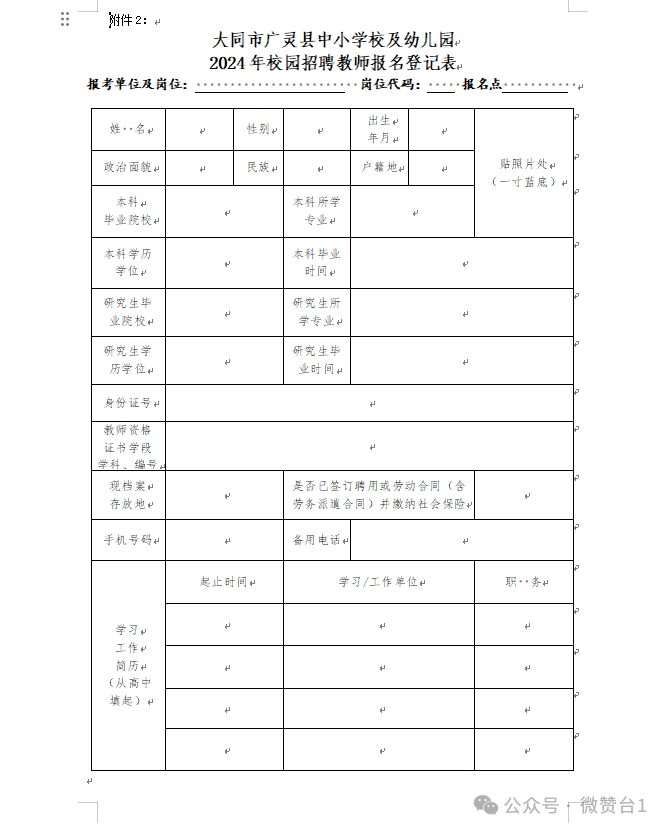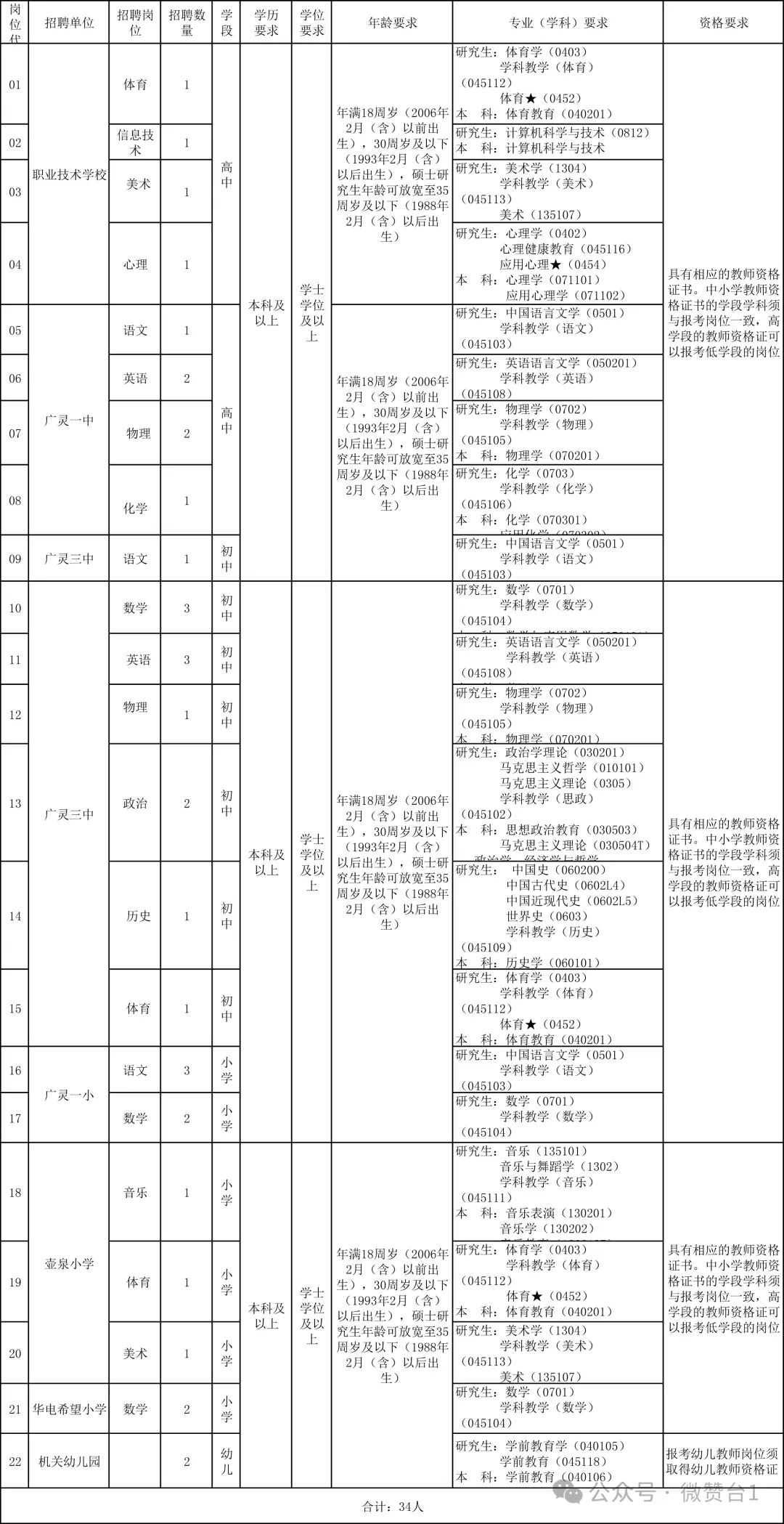 阅读本文前,请您先点击上面的蓝色字体“微赞台2”,再点击“关注”,这样您就可以继续免费收到文章了。每天都有分享。完全是免费订阅,请放心关注。 为加快实施“人才强县”战略,进一步优化教师队伍结构,不断充实中小学校及幼儿园师资力量,广灵县将通过校园招聘方式补充教师34名,现将有关事宜公告如下: 一、招聘对象 符合招聘条件和岗位具体要求的2024年全国普通高等院校应届本科及以上学历的毕业生(不含委培、定向生)。 二、招聘原则 (一)坚持品学兼优、德才兼备的原则; (二)坚持公正公平、竞争择优的原则; (三)坚持按需设岗、按岗招聘的原则; (四)坚持优化结构、保障重点的原则。 三、招聘条件 (一)具有中华人民共和国国籍,且年满18周岁(2006年2月(含)以前出生)。 (二)拥护中国共产党领导,遵纪守法,爱岗敬业。 (三)具有教师职业所需的职业道德、综合素质,且有一定的教学组织管理能力。 (四)具备正常履行职责的身体条件、心理条件。 (五)具有所报岗位要求的学历及学位(2024年7月31日前取得相应的学历和学位证书)。 (六)年龄要求30周岁及以下(1993年2月(含)以后出生),硕士研究生年龄可放宽至35周岁及以下(1988年2月(含)以后出生)。 (七)所学专业必须符合所报岗位专业要求(见附件1)。 (八)具有相应的教师资格证书。报考中小学教师岗位的,教师资格证书的学段学科必须与报考岗位一致,高学段的教师资格证可以报考低学段的岗位;报考幼儿教师岗位的须取得幼儿教师资格证。暂未取得教师资格证书者,2024年8月31日前必须取得,否则取消聘用资格。 不得报名应聘的主要情形: 1.现役军人和在读的非2024年应届毕业生不能报考,研究生不得以本科学历学位及本科所学专业报考; 2.因犯罪受过刑事处罚的、被开除中国共产党党籍和公职的;在立案审查期间或未解除党纪、政纪处分的人员,不能报考; 3.各级公务员招考和事业单位招聘中被认定有舞弊等严重违反考录、招聘纪律行为的人员,不能报考; 4.被依法列为失信联合惩戒对象以及法律、法规规定不符合本次招聘要求的人员,不能报考; 5.报考人员不得报考聘用后即构成回避关系的岗位。应聘者在报名之后、聘用之前已成为试用期内的公务员(参照管理单位工作人员)或已被聘用为事业单位工作人员的,不予聘用; 6.法律、法规规定不得招聘为事业人员的其他情形人员。 四、招聘岗位及数量 大同市广灵县中小学校及幼儿园2024年校园招聘教师共计34名,其中高中教师10名,初中教师12名,小学教师10名,幼儿教师2名。本次招聘教师均为专业技术岗位,单位性质为全额事业单位。 具体招聘岗位及数量见《大同市广灵县中小学校及幼儿园2024年校园招聘教师岗位表》(附件1)。 五、招聘程序 (一)发布招聘公告 招聘公告在三所师范大学网站(北京师范大学、陕西师范大学、山西师范大学)、广灵县人民政府网站(http://www.sx-guangling.gov.cn/)发布。 (二)报名和资格审查 1.采取现场报名的方式,同时进行资格审查。 报名时间:2024年3月12日——3月13日 (上午8:30——12:00、下午14:30——18:00) 地点: (1)北京师范大学京师大厦一层就业指导中心多功能厅103室 (2)陕西师范大学长安校区新勇学生活动中心东210室 (3)山西师范大学科学会堂307室 2.整个招聘环节每人只能选择一个报名点且只能报考一个招聘岗位。 3.报名所需资料 (1)《大同市广灵县中小学校及幼儿园2024年校园招聘教师报名登记表》(见附件2)纸质版2份(粘贴1寸蓝底免冠正面标准证件照片,本人手写签名)及电子版(使用U盘拷贝报送,文件命名方式为“姓名+身份证号码+毕业学校”)。报名表中所填写的专业应当与报考者本人取得高校毕业证书上所载明的专业一致。 (2)近期1寸免冠蓝底彩照2张及照片电子版(照片要求:尺寸25mm*35mm,像素295px*413px,JPG或JPEG格式,不超过50KB),照片电子版请使用U盘拷贝报送,命名方式为“姓名+身份证号码+毕业学校”。 (3)身份证原件及复印件一份。 (4)在读证明(注明:在读学校出具的所学专业、拟毕业时间及毕业时拟取得学历学位证明)及教育部学信网电子学籍报告。 (5)如已取得教师资格证,提供教师资格证原件和复印件。 (6)提供本人学术成果、荣誉表彰情况等复印件。 4.应聘人员提交的所有信息和材料必须真实、准确、有效。凡提供虚假信息和材料获取招聘资格的,或故意隐瞒本人真实情况影响聘用的,一经查实,取消聘用资格。符合招聘条件的人员,现场告知资格审查结果。 资格审查贯穿招聘工作全过程,任何环节发现资格条件不符合岗位要求者,一经查实,即取消应聘或聘用资格。 (三)组织考试 本次招聘采取笔试与面试相结合的方式进行。 1.笔试 笔试内容为专业知识及教育学、教育心理学等综合知识。 笔试成绩满分100分,笔试成绩按60%的比例计入考生综合成绩。笔试成绩设最低合格线为70分,考生笔试成绩须达到70分(含)以上,不达70分者不得进入下一招聘环节。 笔试成绩按招聘单位招聘岗位从高到低排名,根据招聘单位岗位拟招聘人数,按照笔试成绩从高分到低分3:1的比例确定面试人选,若确定人选最后一名出现并列时,一同进入面试环节,不达3:1比例的按实际人员确定面试人选。 2.面试 面试采取现场抽取课题面对评委进行模拟现场教学的形式,面试时间不超过15分钟,面试主要考察应聘人员的教学能力。面试成绩按40%的比例计入