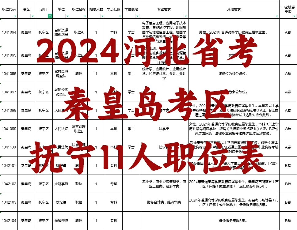 >2024年秦皇岛考区,抚宁11人职位表来袭