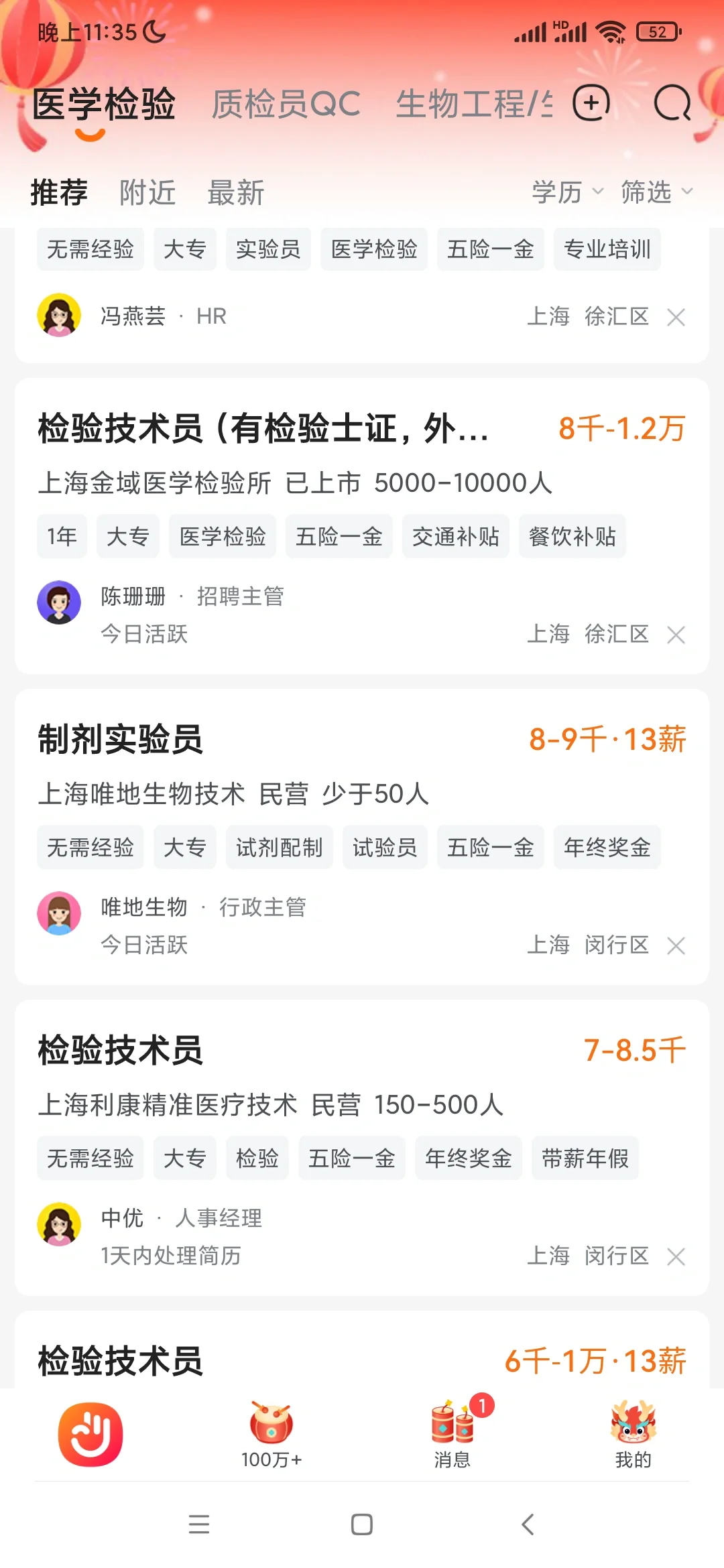 在前程无忧看到上海的医学检验技术专业招聘比重庆多好多,工资待遇看着也很好,还接受无经验的,学历要求也是大专!好心动哇,有没有在上海做检验的友友说一说是不是真的哇❤️