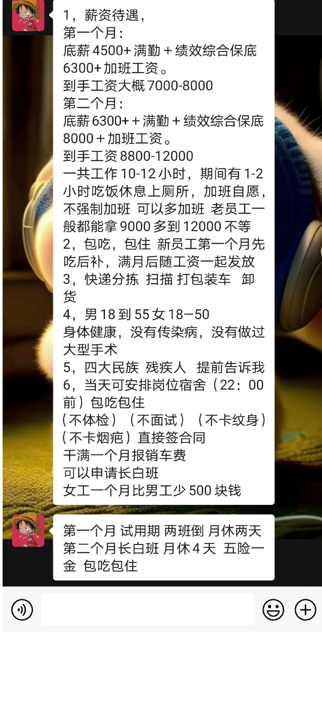 寒假工,北京顺义快递分拣员骗局!!! 12月底,我听这个人说的最低工资6800十,自己也可以吃苦,就去了,他说他们是工厂直招,不是中介,我就去了,去了之后先让你交450元伙食费和住宿费,住宿是一个平房,12人一间,没错,你没听错,是12人一间,热水都没有,说是三顿饭,其实就一顿,还是白水煮的面条,连盐都没有,每天工作10到12个小时,其实是16个小时,1小时提前起床,来回3个小时的路程,为什么距离这么远,因为他们是黑中介,每天天不亮拉一面包车人走,去工厂,这个工厂是他们自己谈的,每天都不一样,路程也不一样,晚上回来12人,你能休息好不,而且他们说的每个月28号发工资,我问干了2个月老员工,他们第一个月工资都没给他们发,他们也没办法,就赖在宿舍,天天等工资,干了几天就跑路的大多数,据我了解到,顺义快递分拣全爆满,现在招人的全是外包给黑中介的黑心工厂,蛇鼠一窝,我第二天就走,找中介退450元时,他们说要扣100元材料费和50元住宿费,我们一群人就打算报警,就这,一番争执,最后也扣了我们50元,没有一个老员工干了2个月拿到2000元的,所以,千万不要干快递分拣,你说你不怕吃苦,但现在这个行业80%都外包出去了,给黑中介,让他们弄,连合同都是假的,甲方连名都不签[失望R]#快递分拣 !!!#分拣员 #工作招聘 |