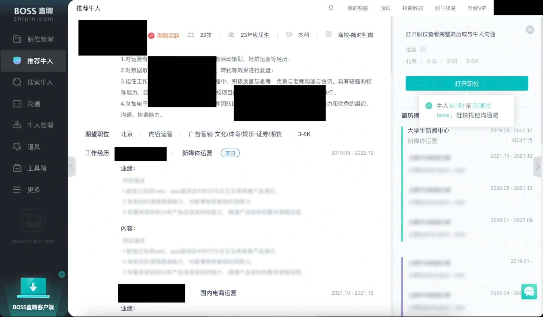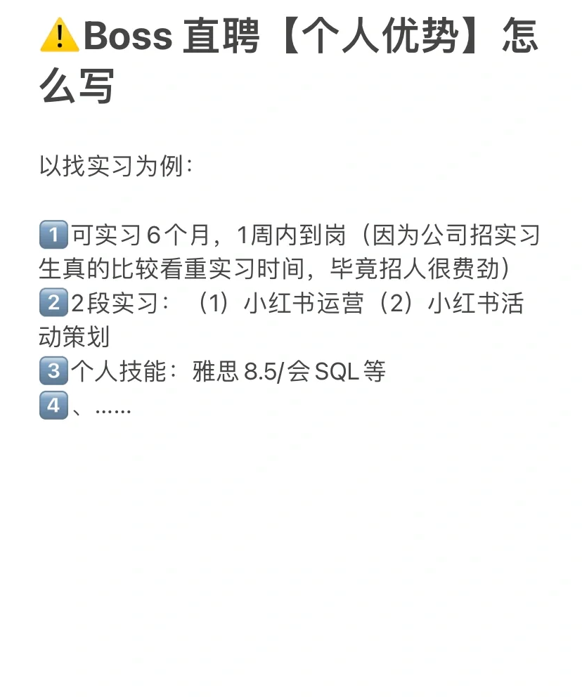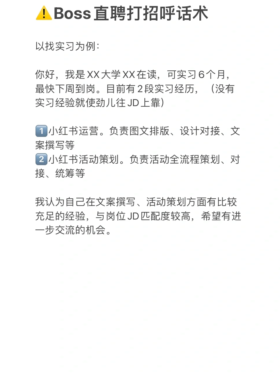 应届生不要用Boss直聘找工作。。。。。。。。。。。 都说应届生不要用Boss直聘找工作,但是其他招聘软件或者官网投递的简历几乎没有任何水花,全部石沉大海……起码用Boss时而显示HR已读,让大家觉得真的在找工作 但是但是!同志们!24届提前批已经开始,暑期实习招聘也在如火如荼的进行中,我们0offer的情况下如何自救扭转这个局面就是重中之重!请往下看! 首先我们看下HR那侧的BOSS后台长什么(看图),了解了后台会露出我们的哪些信息后,我们就对症下药。 首先HR在约面前,会有: 1⃣️打开打招呼的聊天框 2⃣️看在线简历 3⃣️评估匹配度 4⃣️约面 这四步,所以如何让HR能够打开我们的打招呼看到我们的在线简历就是我们要着重用心的地方。 ⚠️首先:不要用默认打招呼内容,一定要更改! 如果你用的是默认打招呼“您好,希望您能看看我的资料……”如何在成百上千的打招呼内容中脱颖而出吸引HR打开你的聊天窗口去了解你呢? 📖所以打招呼内容要改为(以找实习为例):字太多写不下了看图7 ⚠️其次:完善在线简历!尤其是【个人优势】 当HR打开与你的聊天框,就会显示在线简历的上半部分,也就是个人优势部分,所以个人优势部分不要再写:喜欢唱跳rap打篮球了(dbq)! 📖这样写(以找实习为例):字太多写不下了看图8 ⚠️最后:附件简历一定要上传PDF版本! 附件简历制作一定要:美观、简介、字体适中(实在不行咱找个模版去套,我之前用的是知页简历,咱们主打一个节省,知页简历里有免费模版可以薅,而且想里面的模板是根据岗位分类的,比如0实习经历简历模板、新媒体、活动策划简历模板,具体看图9-10),导出PDF版本后命名为:姓名+学校+年纪+求职岗位 ☕️一切准备就绪, 就可以投啦! 这个时候大家可能会面临下一个问题:HR已读未回怎么整? 写不下了同志们,下篇写。 #应届生 #24届 #秋招 #Boss直聘 #求职技巧 #23届校招 #实习生 —————— 📖 00后职场观察员 0内耗0焦虑打工人 职场水货一个,胜在心态好 |