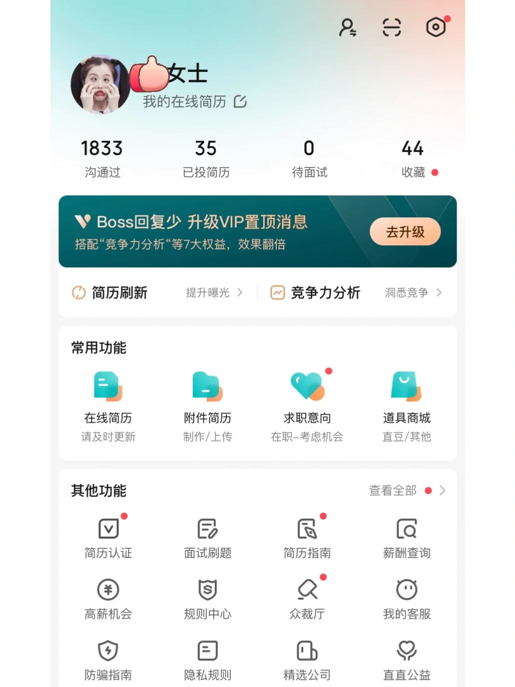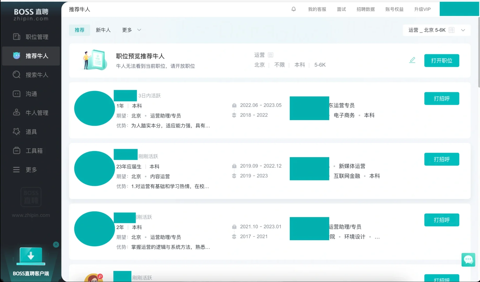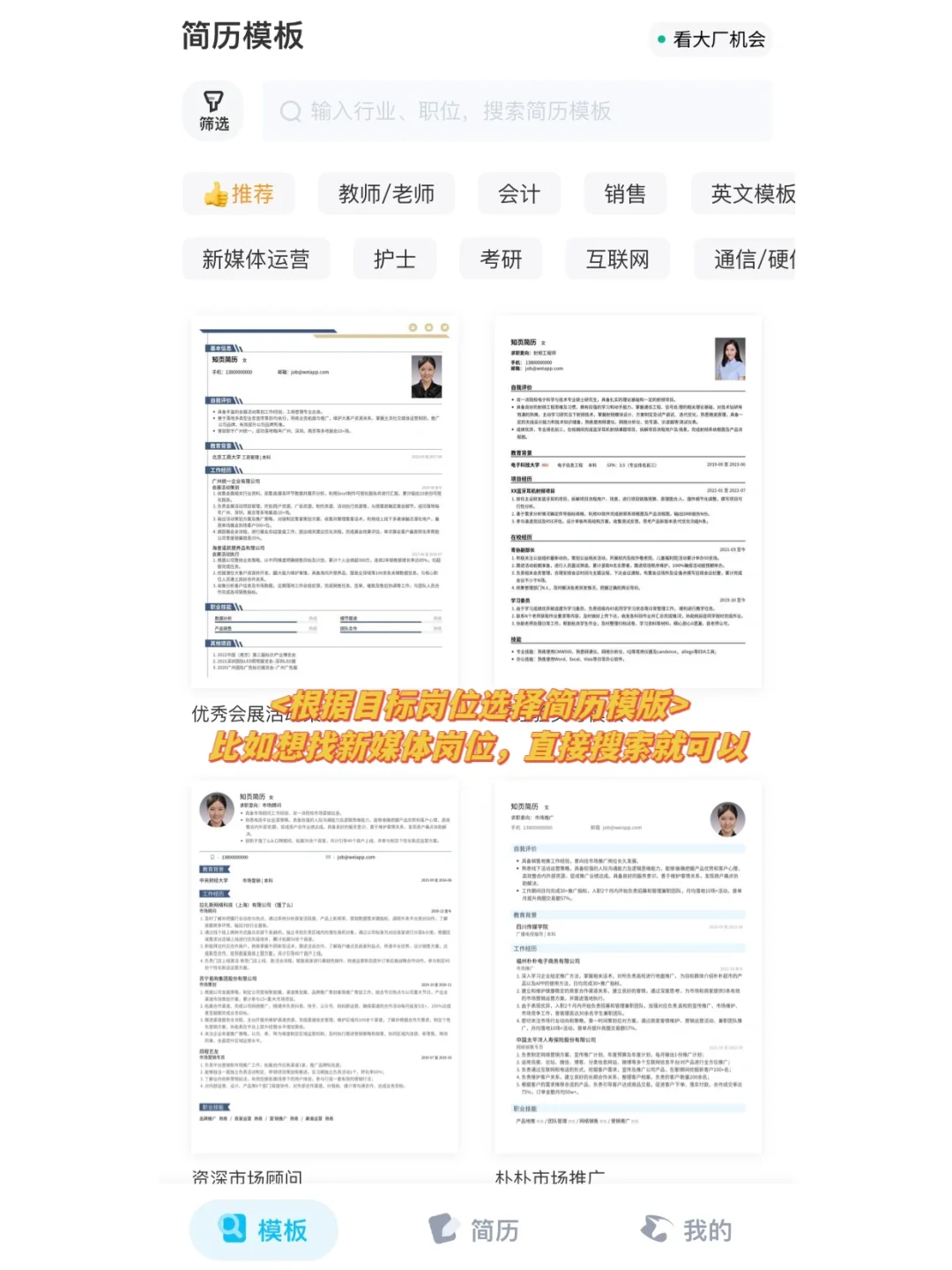 应届生不要用Boss直聘找工作。。。。。。。。。。。 都说应届生不要用Boss直聘找工作,但是其他招聘软件或者官网投递的简历几乎没有任何水花,全部石沉大海……起码用Boss时而显示HR已读,让大家觉得真的在找工作 但是但是!同志们!24届提前批已经开始,暑期实习招聘也在如火如荼的进行中,我们0offer的情况下如何自救扭转这个局面就是重中之重!请往下看! 首先我们看下HR那侧的BOSS后台长什么(看图),了解了后台会露出我们的哪些信息后,我们就对症下药。 首先HR在约面前,会有: 1⃣️打开打招呼的聊天框 2⃣️看在线简历 3⃣️评估匹配度 4⃣️约面 这四步,所以如何让HR能够打开我们的打招呼看到我们的在线简历就是我们要着重用心的地方。 ⚠️首先:不要用默认打招呼内容,一定要更改! 如果你用的是默认打招呼“您好,希望您能看看我的资料……”如何在成百上千的打招呼内容中脱颖而出吸引HR打开你的聊天窗口去了解你呢? 📖所以打招呼内容要改为(以找实习为例):字太多写不下了看图7 ⚠️其次:完善在线简历!尤其是【个人优势】 当HR打开与你的聊天框,就会显示在线简历的上半部分,也就是个人优势部分,所以个人优势部分不要再写:喜欢唱跳rap打篮球了(dbq)! 📖这样写(以找实习为例):字太多写不下了看图8 ⚠️最后:附件简历一定要上传PDF版本! 附件简历制作一定要:美观、简介、字体适中(实在不行咱找个模版去套,我之前用的是知页简历,咱们主打一个节省,知页简历里有免费模版可以薅,而且想里面的模板是根据岗位分类的,比如0实习经历简历模板、新媒体、活动策划简历模板,具体看图9-10),导出PDF版本后命名为:姓名+学校+年纪+求职岗位 ☕️一切准备就绪, 就可以投啦! 这个时候大家可能会面临下一个问题:HR已读未回怎么整? 写不下了同志们,下篇写。 #应届生 #24届 #秋招 #Boss直聘 #求职技巧 #23届校招 #实习生 —————— 📖 00后职场观察员 0内耗0焦虑打工人 职场水货一个,胜在心态好 |