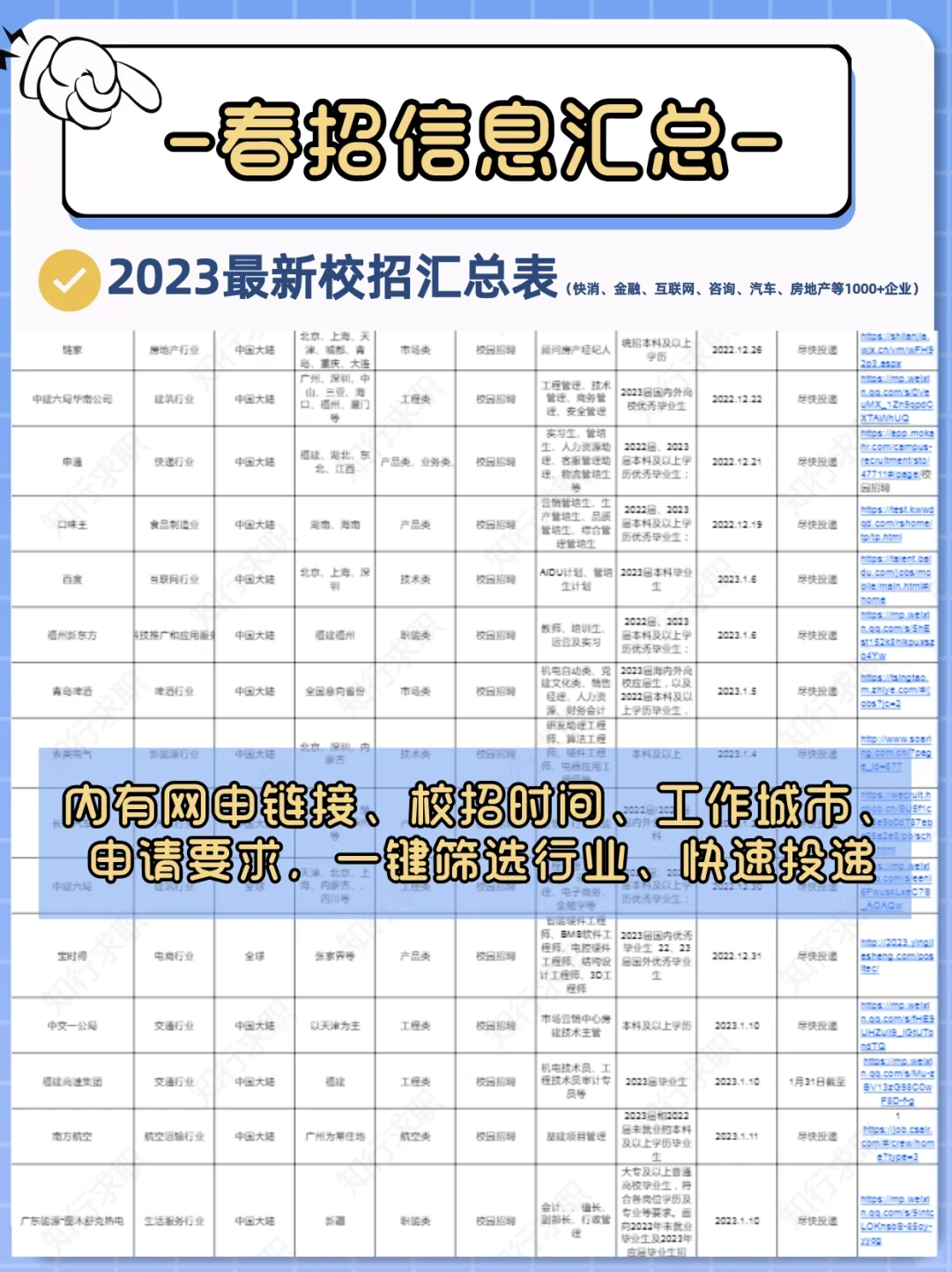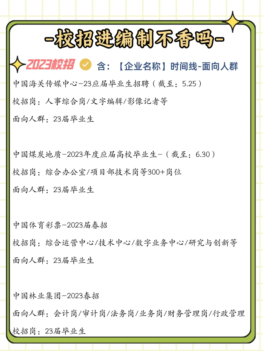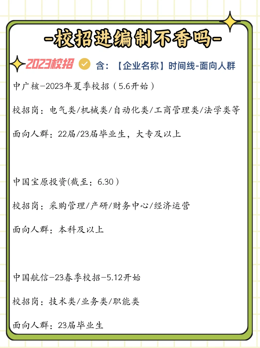 最好进编制的就是校招,别犹豫 🙋🏻🙋🏻♀哈喽,我是大家的克里斯学长~ 校招入编真的好香!因为每年国央企、事业单位放出的岗远远多于国考省考。再加上6月到8月又是夏招,是国央企积极响应促进高校毕业生就业工作的号召,专门开的一次夏季招聘 校招机会是远远大于考公的,每年校招高峰期国央企也是最多的!现在越来越多的应届生都想去考公,竞争越来越激烈,大家不妨也看看校招入编这条路,多抓住几个机会 表格学长会每天更新校招的信息,求职技巧等干货。并把这些校招信息整理起来啦,里面包含了很多校招的信息,(国企,央企,外企,等都包含在内了)具体看图3 💗心动的小伙伴们!准备好简历投递吧🔗看学长帮助大家拿到心仪的offer! 🍎✍🏻【1】get,或者戳学长,都会一 一回复的 @薯队长 @校园薯 #校招 #23届校招 #应届生找工作 #春招 #事业单位 #应届生 #工作 #编制 #求职培训 #留学生求职 |