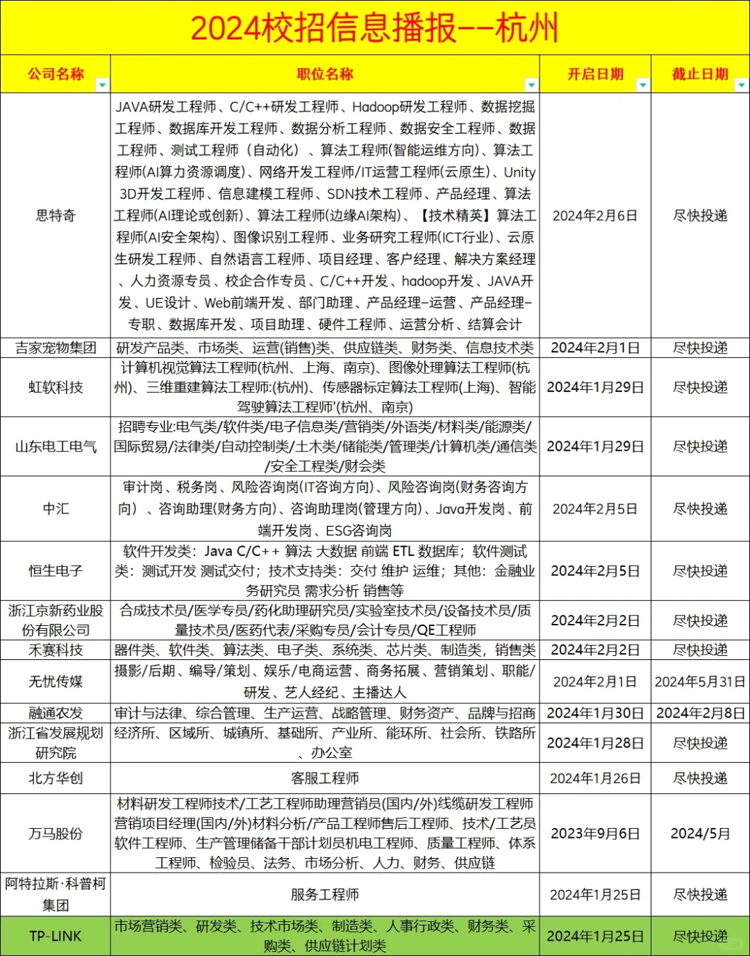 杭州校招岗位|2024春招岗位突然多了 🔥【杭州校招信息信息】想在杭州看工作机会?这些公司近期才刚刚开启 🔥思特奇2024年2月6日正式开启;吉家宠物集团2024年2月1日正式开启;虹软科技2024年1月29日正式开启;山东电工电气2024年1月29日正式开启;中汇2024年2月5日正式开启;恒生电子2024年2月5日正式开启;浙江京新药业股份有限公司 2024年2月2日正式开启;禾赛科技 2024年2月2日正式开启;无忧传媒2024年2月1日正式开启;融通农发2024年1月30日正式开启; 💪🏻无论你目标是外企还是国企亦或者民营,一定把握住呀,祝offer多多,新年快乐 #杭州找工作 #留学生秋招 #应届生找工作 #2024届毕业生 #求职季 #大学生求职 #央企国企招聘信息 #外企求职 #大厂校招 |