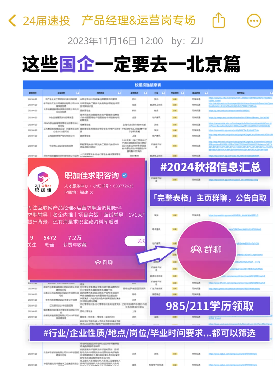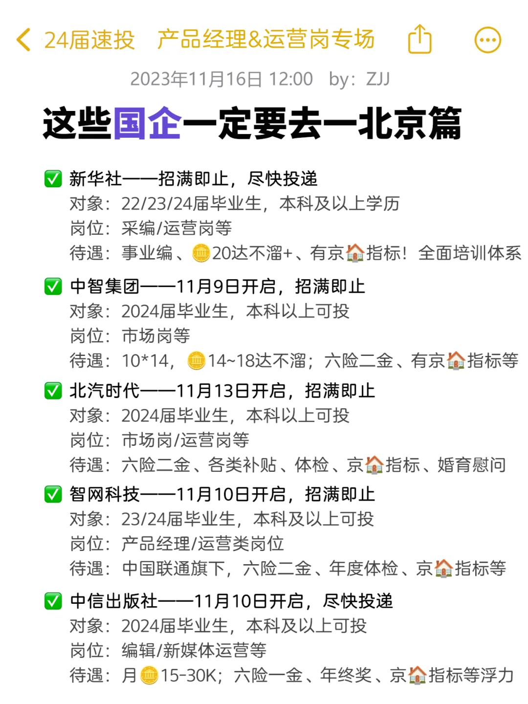 这些国企一定要去❗❗— 北京篇 11月是国企秋招专场,对于还想进国企的24届宝子来讲真的是福音了!今天整理了北京国央企汇总,想在北京找国央企、事业编工作的宝子抓紧时间啦📢 👷🏼♀️冲央国企的原因根本不用我多说了吧!朝九晚五工作稳定,五险一金、节假日这些该有的法定浮力待遇是一样都不会少! 💡其实有很多央国企实力都很强,待遇也很好,但比较低调,投递的人少,选这些央国企报考,拿offer机率会更高哦~ 💡所以!千万不要焦虑,国企都来捞人了,我们需要做的就是多关注招聘信息,坚持投递!会一直给大家更新的! 👊🏻近期的秋招补录要求降低了很多,23届未就业的宝子,能报考的岗位也多了不少,想拿offer的宝子们要抓住机会~ ✅更多11月可投的国企都整理在【P2】里了,招聘详情+网申直达🔗都有,建议宝子们看到有心仪的岗位,尽快投递! #国企 #找工作 #国企工作 #北京国企 #国企打工人 #秋招 #校招 #24秋招 #24校招 #24届秋招 #24届校招 #应届生 #应届生找工作 #留学生求职 #海归求职 #求职季 #求职经验侃侃谈 #国企秋招 #留学生 #职加佳 |