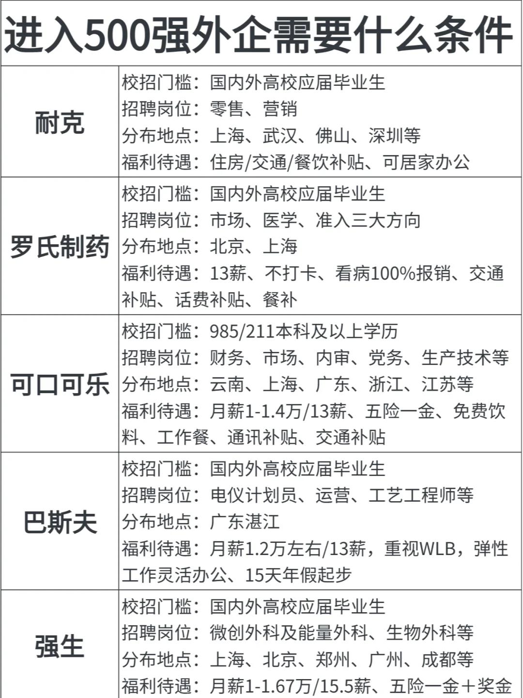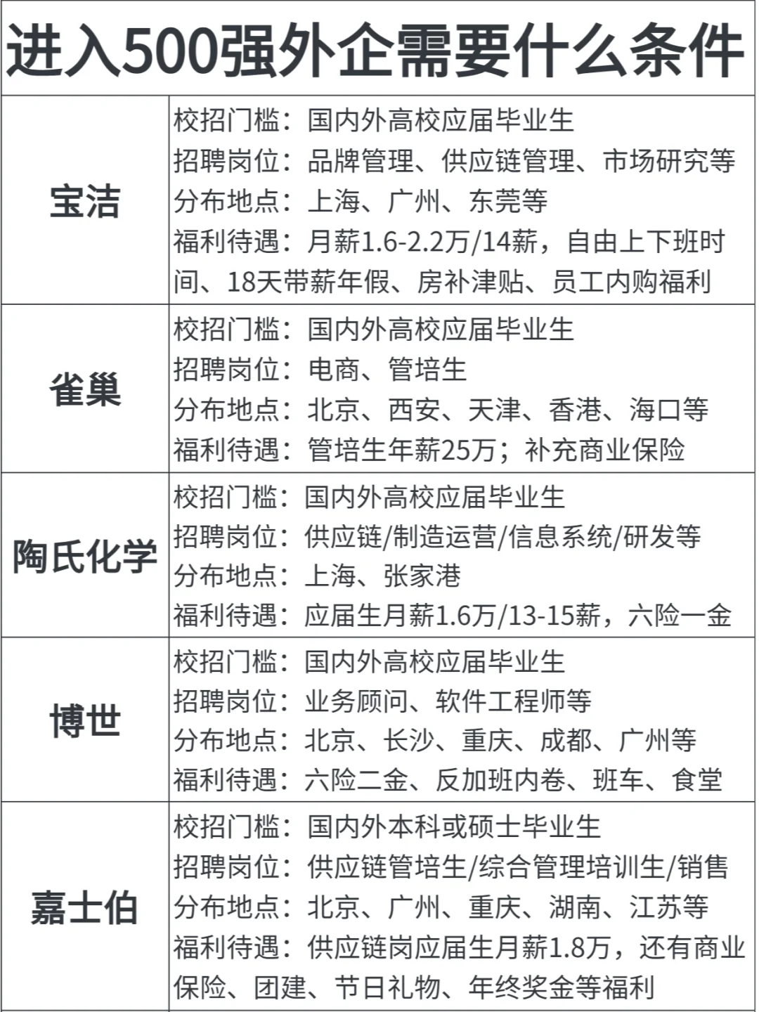 2024还有人不知道进外企的条件吗?已汇总 一、耐克 校招门槛:国内外高校应届毕业生 招聘岗位:零售、营销 分布地点:上海、武汉、佛山、深圳等 福利待遇:住房、交通、餐饮补贴,可居家办公 二、罗氏制药 校招门槛:国内外高校应届毕业生 招聘岗位:市场、医学、准入三大方向 分布地点:北京、上海 福利待遇:13薪,不打卡、看病100%报销、交通补贴、话费补贴、餐补 三、可口可乐 校招门槛:985/211本科及以上学历 招聘岗位:财务、市场、内审、党务、生产技术等 分布地点:云南、上海、广东、浙江、江苏等 福利待遇:月薪1-1.4万/13薪、五险一金、免费饮料、工作餐、通讯补贴、交通补贴 四、巴斯夫 校招门槛:国内外高校应届毕业生 招聘岗位:电仪计划员、运营、工艺工程师等 分布地点:广东湛江 福利待遇:月薪1.2万左右/13薪,重视WLB,弹性工作灵活办公、15天年假起步 五、强生 校招门槛:国内外高校应届毕业生 招聘岗位:微创外科及能量外科、生物外科等 分布地点:上海、北京、郑州、广州、成都等 福利待遇:月薪1-1.67万/15.5薪、五险一金+奖金 六、宝洁 校招门槛:国内外高校应届毕业生 招聘岗位:品牌管理、供应链管理、市场研究等 分布地点:上海、广州、东莞等 福利待遇:月薪1.6-2.2万/14薪,自由上下班时间、18天带薪年假、房补津贴、员工内购福利 七、雀巢 校招门槛:国内外高校应届毕业生 招聘岗位:电商、管培生 分布地点:北京、西安、天津、香港、海口等 福利待遇:管培生年薪25万;补充商业保险 八、陶氏化学 校招门槛:国内外高校应届毕业生 招聘岗位:供应链、制造运营、信息系统、研发等 分布地点:上海、张家港 福利待遇:应届生月薪1.6万/13-15薪,六险一金 九、博世 校招门槛:国内外高校应届毕业生 招聘岗位:业务顾问、软件工程师等 分布地点:北京、长沙、重庆、成都、广州等 福利待遇:六险二金、反加班内卷、班车、食堂 十、嘉士伯 校招门槛:国内外本科或硕士毕业生 招聘岗位:供应链管培生/综合管理培训生/销售 分布地点:北京、广州、重庆、湖南、江苏等 福利待遇:供应链岗应届生月薪1.8万,还有商业保险、团建、节日礼物、年终奖金等福利 #留学生求职 #留学生 #外企 #美国留学生 #英国留学生 #澳洲留学生 #应届生求职 #求职 #校招 #大厂 #名企 |