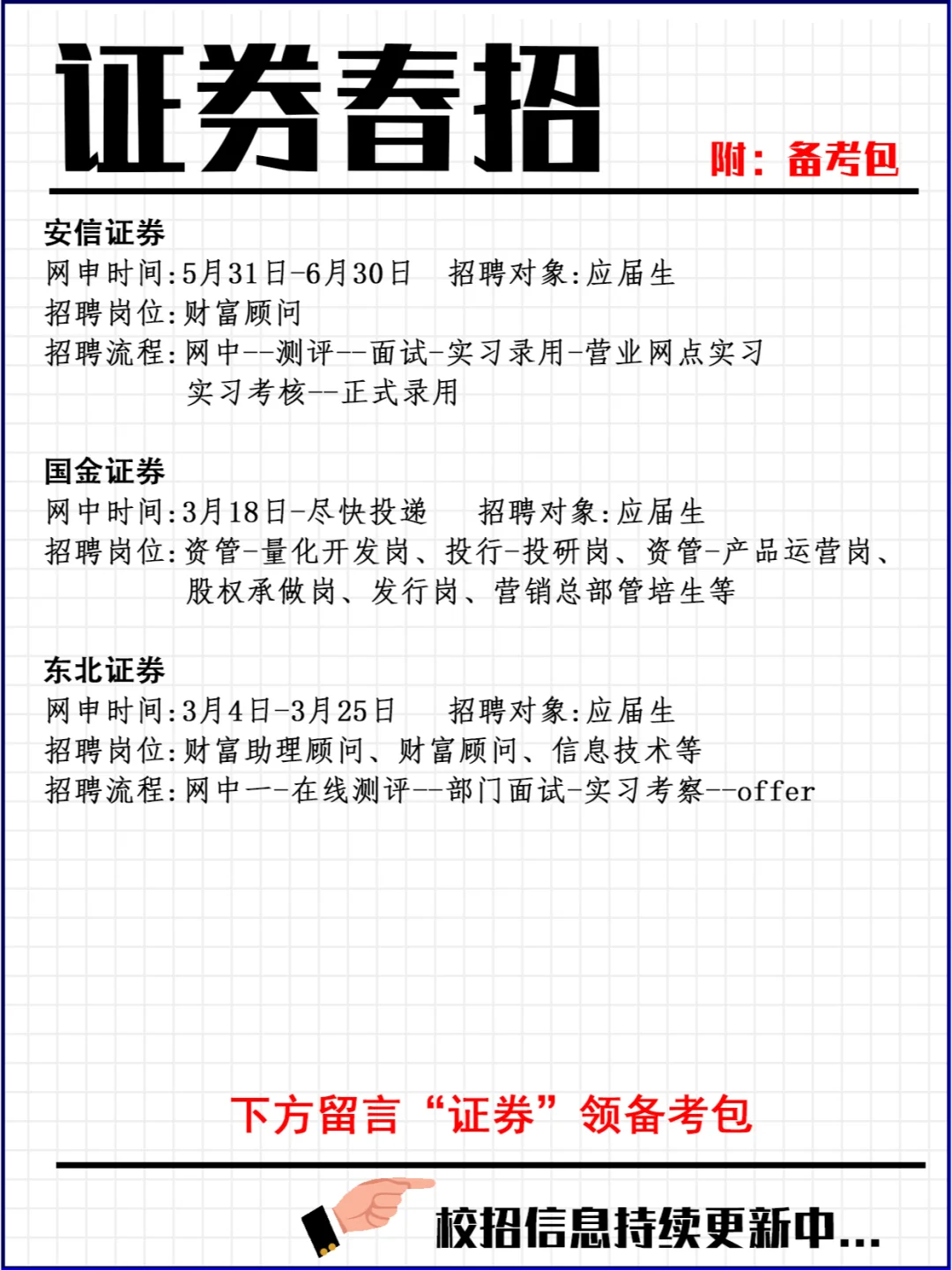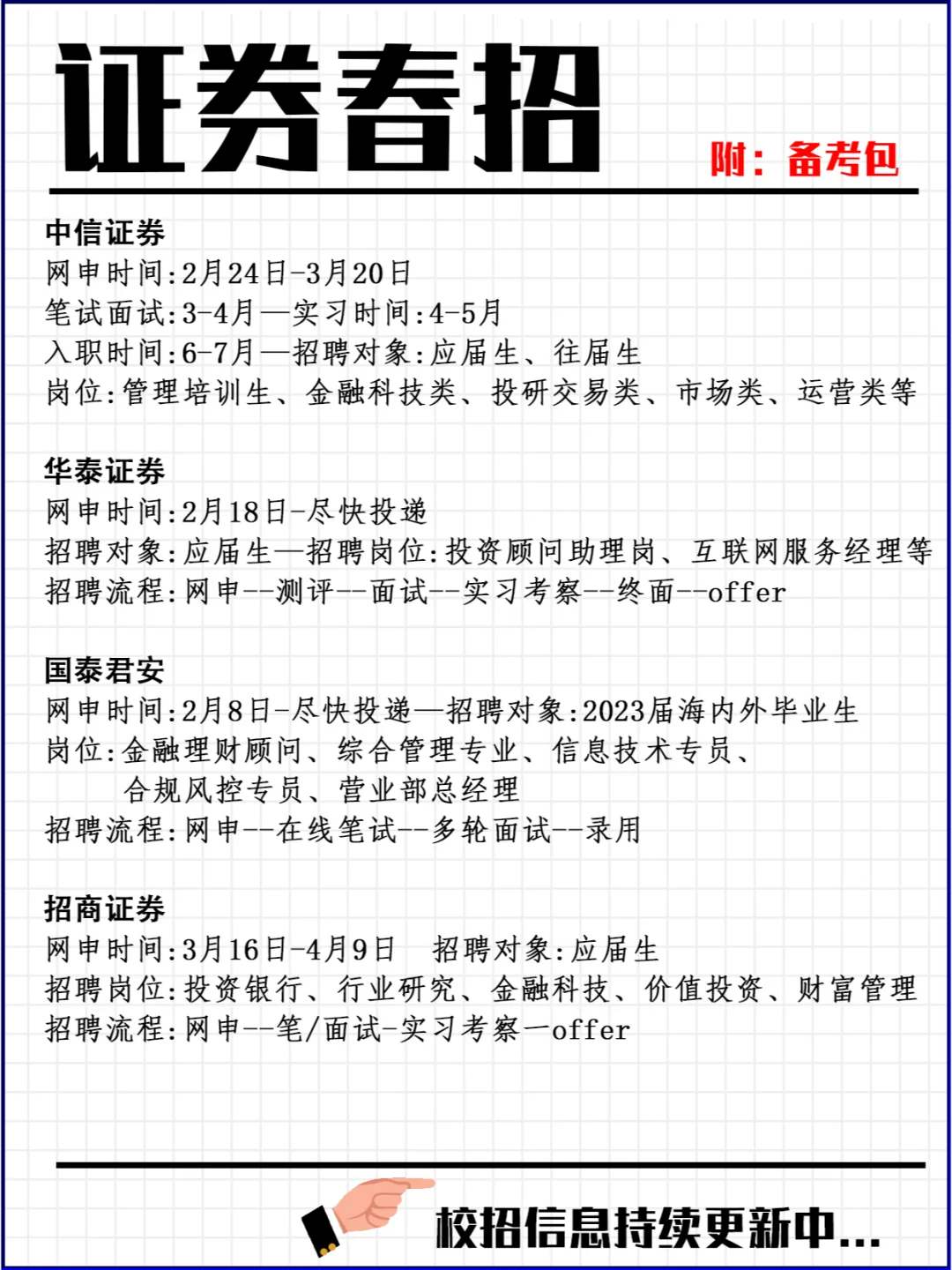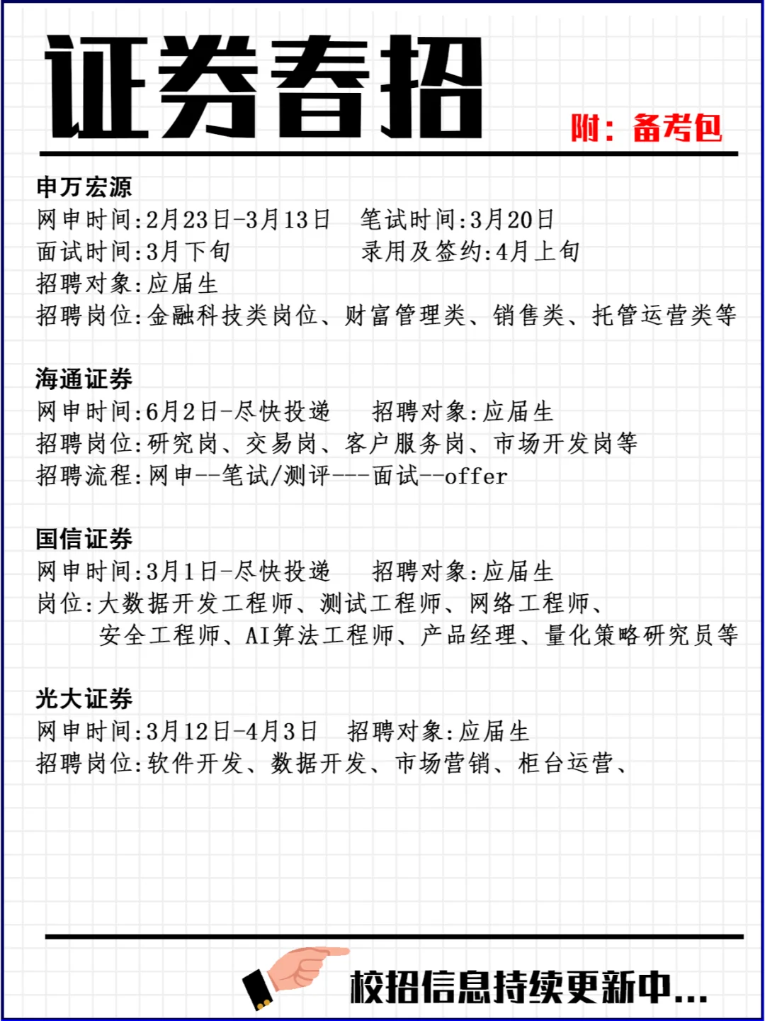 这些信息差一定要了解!证券行业春招时间表 证券行业的春季招聘通常在每年的[1-3]月份开始进行,这是根据证券行业的业务规律和市场情况来决定的哟。🌸在这段时间里,证券公司和相关金融机构将举办一系列的面试和招聘活动,希望吸引优秀的人才加入他们的团队。 一般来说,证券行业的春招可分为以下几个环节。首先,证券公司会提前发布招聘信息,通常在[12月]左右,以吸引应聘者的关注并给予他们充足的准备时间。接下来,开放式笔试是春季招聘的重要环节,一般安排在[1月]。通过笔试,公司能初步筛选出合适的候选人并进行初步的能力评估。然后,面试环节开始啦,通常安排在[2月]。面试时间会根据公司情况有所不同,有些公司可能单独安排面试,而有些公司可能会选择集中面试的方式。最后,根据面试结果,公司逐步发放录用通知书,约谈候选人进行入职谈判和其他安排事项。 值得一提的是,尽管春季招聘一般在[1-3]月份集中进行,但具体的时间安排可能有所不同。不同公司可能会有不同的时间表,也可能根据业务需求进行调整哦。因此,对于准备参加证券行业春季招聘的求职者来说,要及时关注和收集各公司的招聘信息是非常重要的,只有这样,才能更好地把握春季招聘的时间节点,并做好相应的准备。💪 总之,证券行业的春季招聘是一个重要的机遇,对于想要进入证券行业的毕业生们来说,了解春季招聘的时间信息非常关键啊。应聘者们需要在合适的时间节点积极准备,提前查找招聘信息、备战笔试和面试,并密切关注招聘进展。只有做好充分的准备,在合适的时间节点积极参与招聘活动,才能提高自己的竞争力,获得更好的就业机会。🍀 #24届 #招聘 #工作招聘 #应届生找工作 #证劵 #券商招聘 #券商春招 #证劵春招 #春招 #2024春招 #校招 |