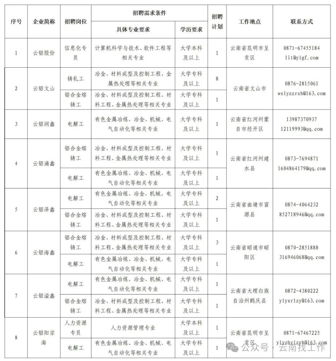 本平台不向求职者收取任何费用,每天发布精选职位信息,为你优先推送匹配企业,助你轻松找到好工作!请大家在找工作时提高警惕,凡涉及收取费用或扣押证件、几乎不面试就录取等情况仔细辨别,谨防受骗噢。如遇到问题可向我们反馈核实删除,本平台不承担连带责任。 “找工作”咨询下方招聘负责人,需要“商务合作”扫码添加小编~一、企业简介 云南铝业股份有限公司(以下简称“公司”)系国有控股上市企业,始建于1970 年,1998 年改制上市(股票代码:000807),2018年12月正式进入中铝集团,是全国有色行业、中国西部省份工业企业中唯一一家“国家环境友好企业”,是中国“绿色低碳水电铝”发展的践行者。多年来,公司坚持走绿色低碳发展之路,准确把握铝行业发展规律,以打造绿色、低碳、清洁、可持续的“水电铝加工一体化”产业模式为核心,构建了集铝土矿—氧化铝—炭素制品—铝冶炼—铝加工为一体的产业链。目前,公司旗下拥有十余家二级企业,具备年产铝土矿264万吨、氧化铝140万吨、水电铝305万吨、铝合金及铝加工产品160万吨、炭素制品80万吨的生产能力,总资产近400亿元。近两年利润总额分别为46.88亿元、59.07亿元。当前,公司正在着力延链补链强链,积极推进基地经济发展,至2025年,将打造“3+3”六大绿色铝材一体化产业集群/基地(红河州、曲靖市、昭通市3个百万吨级产业集群,昆明市、文山州、大理州3个百亿级产业基地),力争全产业链产值达到1500亿元,招商引资集聚发展拉动产值1500亿元,实现原铝100%就地转化,形成从铝水到终端产品的“1+N”全产业链绿色发展格局。处于高速发展的云铝,期待优秀人才的加入。(一)遵纪守法,诚实守信,具有良好的品行和职业操守。(二)身心健康,具有正常履行岗位职责的身体条件和心理素质。(一)提供具有市场竞争力的薪酬福利,薪酬待遇按用人单位有关制度执行。(二)员工与公司签订劳动合同后,按照相关规定为新招录员工缴纳六险二金,员工按规定享受带薪年休假、探亲假、婚假、丧假、产假等。(三)公司实行市场化薪酬体系,在公司效益好的情况下,员工薪资可按一定比例合理增长。(四)公司设有食堂、交通车、宿舍及其它生活配套设施,经常开展文体娱乐活动,丰富员工业余生活。(五)对新招录的全日制硕士及以上学历学生或重点(一本)院校毕业的本科学历学生,计发安家费。(3)入选教育部双一流大学建设院校的本科学历或一本院校双学士人员80000元。(4)一本院校的本科学历人员60000元(不包含挂靠一本院校的普通本科院校毕业生)。(4)入选教育部双一流大学建设院校的本科学历或一本院校双学士人员每次发放16000元。(5)一本院校的本科学历人员每次发放12000元。校园宣讲会/双选会,公司将择期在部分省内外高校进行现场招聘活动。投递方式:在规定时间内将报名表、简历及相关证明材料电子版发送至应聘企业邮箱。根据应聘者提供的信息和材料,由用人单位根据招聘岗位的资格条件进行资格审查,确定进入笔试入围人员。用人单位根据应聘人员笔试、面试成绩,履行有关决策程序确定拟录用人选。七、云南铝业股份有限公司所属各招聘单位简介,请扫描下方二维码查看发布招聘 / 商务合作 / 进求职群 添加小编微信:yzpkf10 |