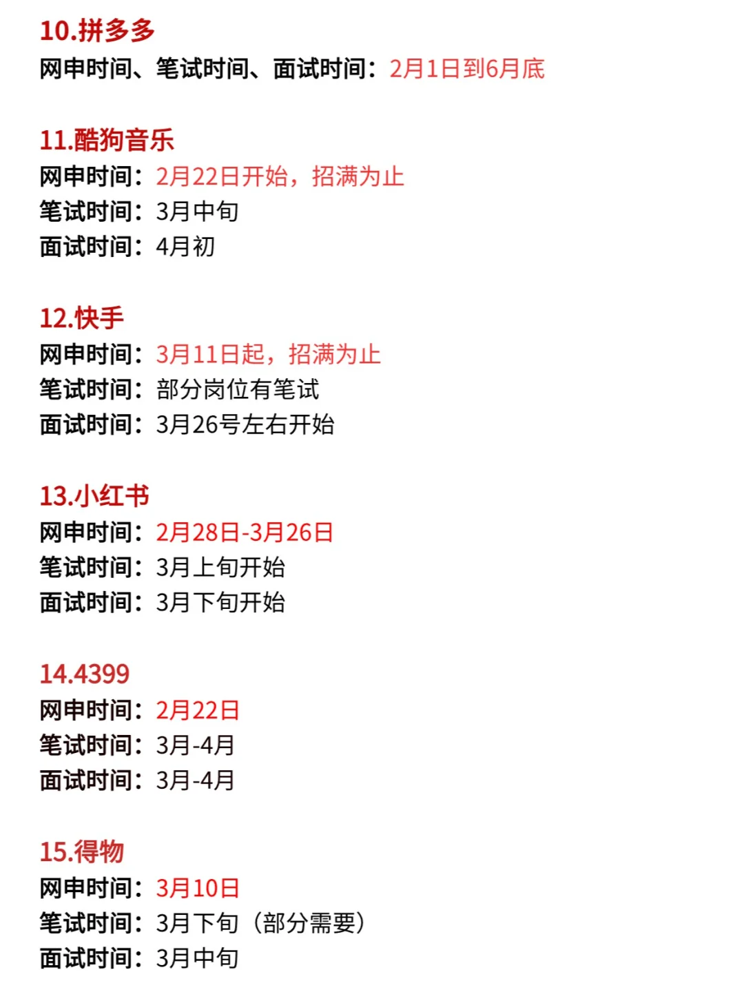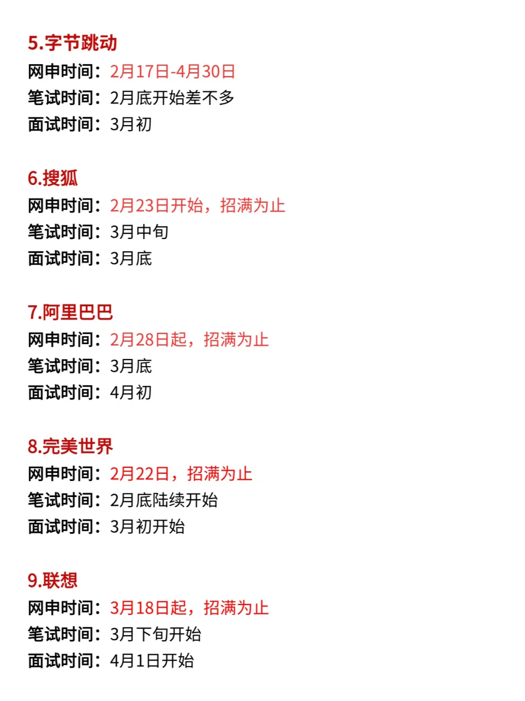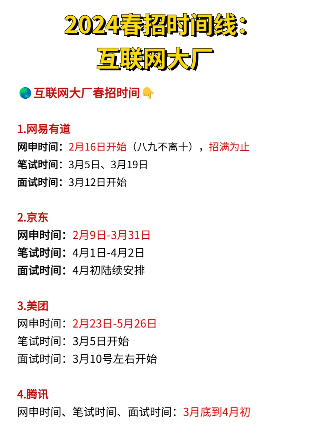 24届春招🔥互联网大厂春招时间表 秋招还没拿到满意offer?别急别急,春招还有机会,互联网大厂春招时间表牛牛给你整理好了!🐎住认真看噢年后转运!年后找工作,offer从四面八方来✔ ❗❗❗ 互联网大厂春招时间👇 ⭐网易有道 网申时间:2月16日开始(八九不离十),招满为止 笔试时间:3月5日、3月19日 面试时间:3月12日开始 ⭐京东 网申时间:2月9日-3月31日 笔试时间:4月1日-4月2日 面试时间:4月初陆续安排 ⭐美团 网申时间:2月23日-5月26日 笔试时间:3月5日开始 面试时间:3月10号左右开始 ⭐腾讯 网申时间、笔试时间、面试时间:3月底到4月初 ⭐字节跳动 网申时间:2月17日-4月30日 笔试时间:2月底开始差不多 面试时间:3月初 ⭐搜狐 网申时间:2月23日开始,招满为止 笔试时间:3月中旬 面试时间:3月底 ⭐阿里巴巴 网申时间:2月28日起,招满为止 笔试时间:3月底 面试时间:4月初 ⭐完美世界 网申时间:2月22日,招满为止 笔试时间:2月底陆续开始 面试时间:3月初开始 ⭐联想 网申时间:3月18日起,招满为止 笔试时间:3月下旬开始 面试时间:4月1日开始 ⭐拼多多 网申时间、笔试时间、面试时间:2月1日到6月底 ⭐酷狗音乐 网申时间:2月22日开始,招满为止 笔试时间:3月中旬 面试时间:4月初 ⭐快手 网申时间:3月11日起,招满为止 笔试时间:部分岗位有笔试 面试时间:3月26号左右开始 ⭐小红书 网申时间:2月28日-3月26日 笔试时间:3月上旬开始 面试时间:3月下旬开始 ⭐4399 网申时间:2月22日 笔试时间:3月-4月 面试时间:3月-4月 ⭐得物 网申时间:3月10日 笔试时间:3月下旬(部分需要) 面试时间:3月中旬 🚩牛牛小技巧: 关注🐮牛客-【校招日常】页面的最近更新,可以关注到新鲜公司动态喔~ #春招分享 #春招 #春招信息 #24届春招 #互联网公司 #互联网春招 #互联网大厂 #互联网大厂实习 #求职 #应届生 #找工作 #春招时间 #春招时间线 |