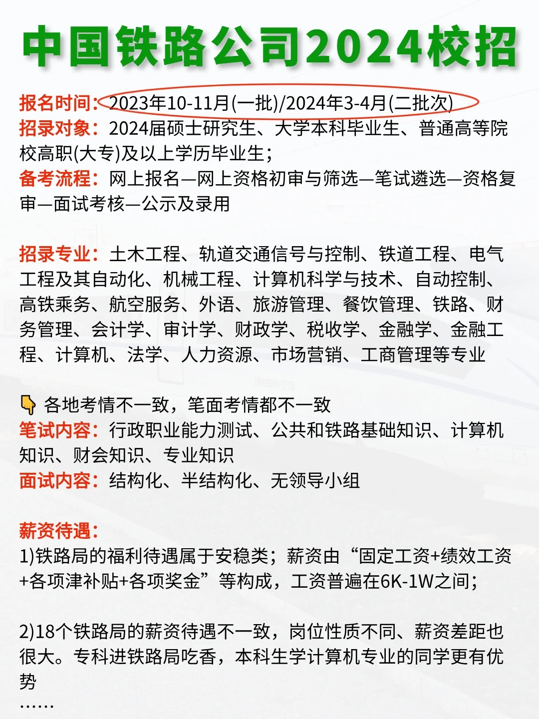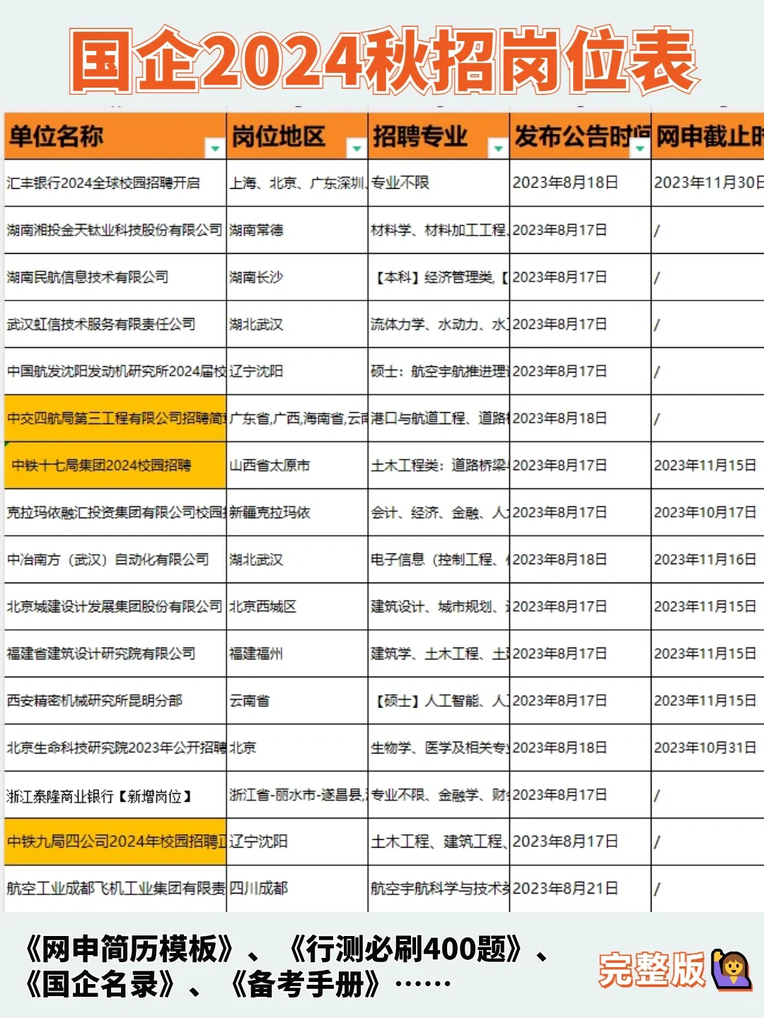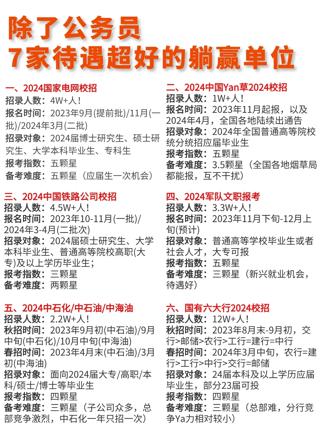 除了公务员,2024年待遇超好的7大躺赢单位💰 如果觉得考公过于卷,考研又怕考不上,想过工作稳定薪资不低的work-life balance的生活,那姐妹们不如看看这7家待遇超好的体制单位👇 一、中国YAN草 招录人数:1W+人! 报名时间:2023年11月起报,以及2024年4月,全国各地陆续出通告 招录对象:2024年全国普通高等院校统分统招应届毕业生 备考难度:3.5颗星(全国各地烟草局都能报,互不干扰) 二、2024国家电网校招 招录人数:4W+人! 报名时间:2023年9月(提前批)/11月(一批)/2024年3月(二批) 招录对象:2024届博士研究生、硕士研究生、大学本科毕业生、专科生 备考难度:五颗星(应届生一次机会) 三、军队文职 招录人数:3.3W+人! 报名时间:2023年11月下旬-12月上旬(预计) 招录对象:普通高等学校毕业生或者社会人才,大专可报 备考难度:三颗星(新兴就业机会,待遇好) 四、国有六大行 招录人数:12W+人! 秋招时间:2023年8月末-9月初 春招时间:2024年3月中旬 招录对象:24届本科及以上学历应届毕业生,部分23届可投 备考难度:三颗星(总部难,分行竞争Ya力相对较小) 五、中石油/中石化/中海油 招录人数:2.2W+人! 秋招时间:2023年9月初(中石油)/9月中旬(中石化)/10月中旬(中海油) 春招时间:2023年4月末(中石油)/3月初(中海油) 招录对象:面向2024届大专/高职/本科/硕士/博士等毕业生 备考难度:三颗星(子公司众多,总部竞争激烈,中石化一年只招一次) 六、国家能源 招录人数:1.1W+人! 报名时间:2023年10月初/2024年4月末 招聘对象:2024届全国普通高等院校统招统分应届毕业生 备考难度:三颗星(春招、夏招、秋招三次机会) 七、中国铁路公司 …… 📝近来,国企秋招进入爆发期,小编整理了一份《国企岗位信息表》+《国企秋招备考包》,里面包含行测400题、网申模板、备考手册等等详细信息。一定要仔细看哦!🎁 #事业编 #女生必看 #国企 #公务员考试 #体制内 #不懂就问有问必答 #考编 #大学生 #校招 #工作 #秋招 #应届生找工作 #国企工作 |