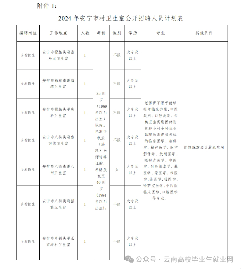 安宁市下属3家卫生院共公开招聘乡村医生7名。具体招聘岗位及招聘条件,详见《2024年安宁市村卫生室公开招聘人员计划表》(后简称:《岗位计划表》)(附件1)。