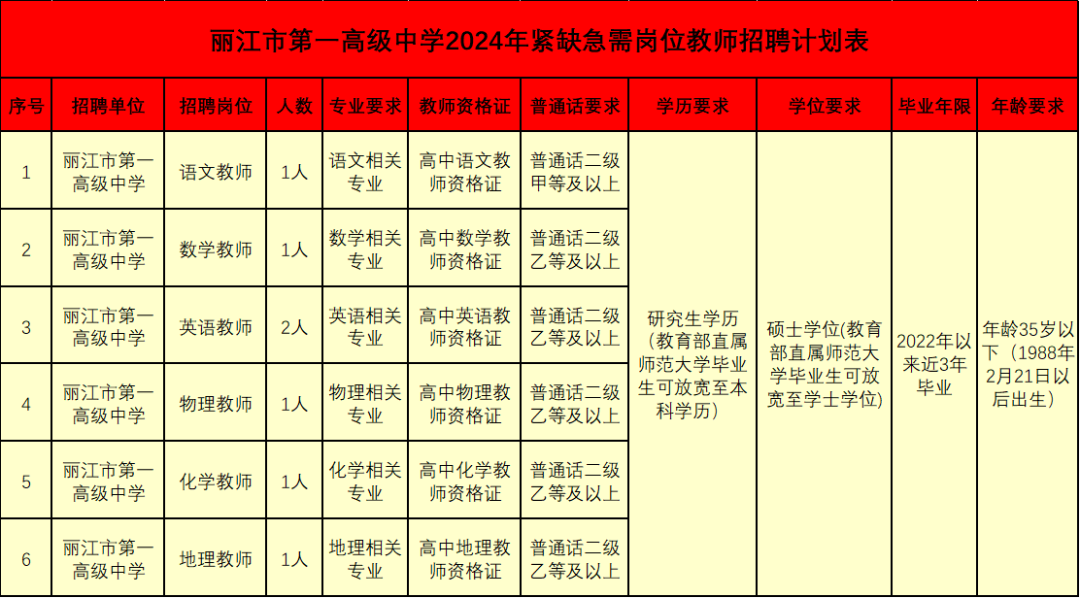 1.丽江市第一高级中学2024年紧缺急需岗位教师招聘计划表