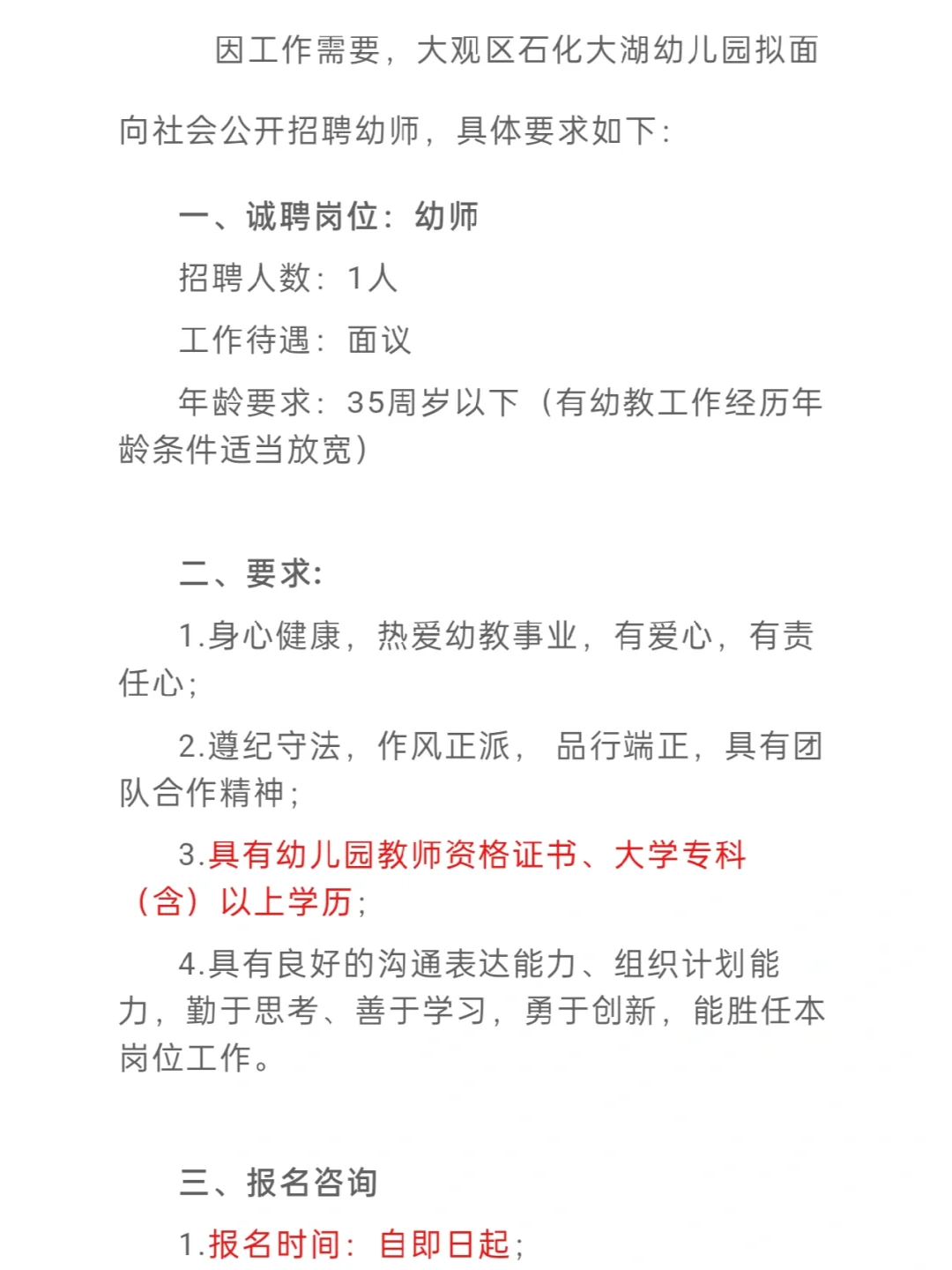 >安庆大观区石化大湖幼儿园2022招聘公告!