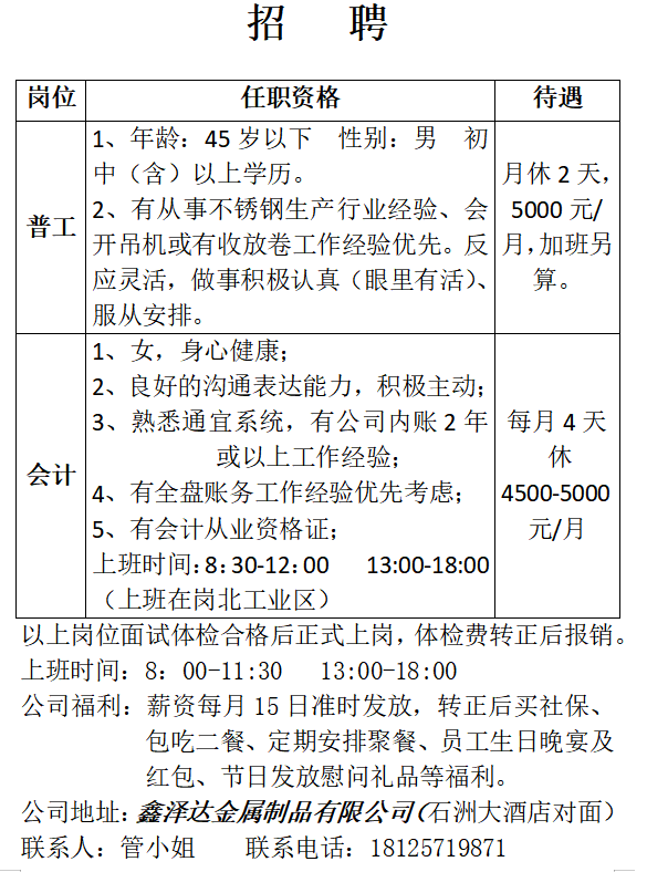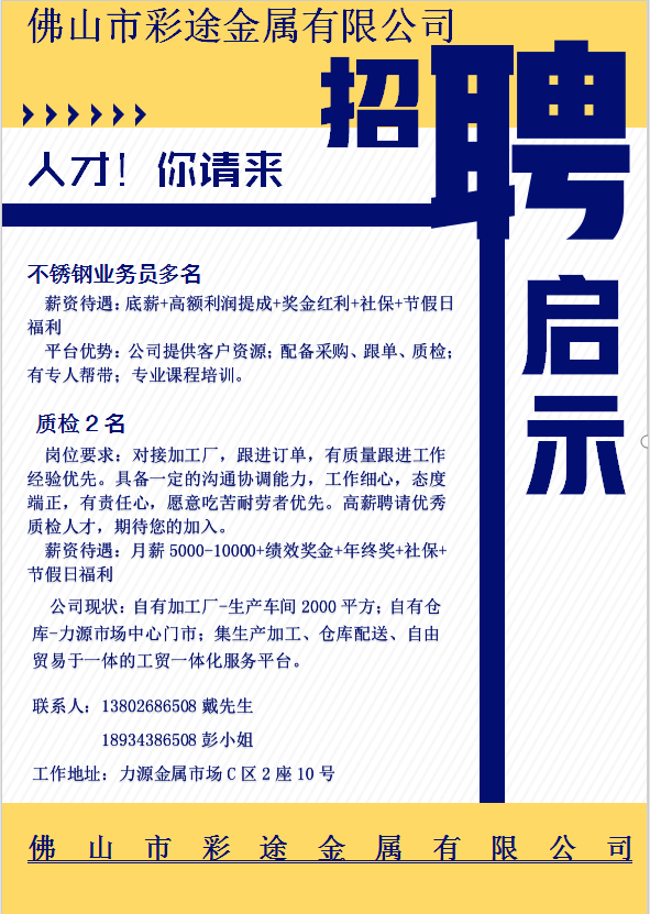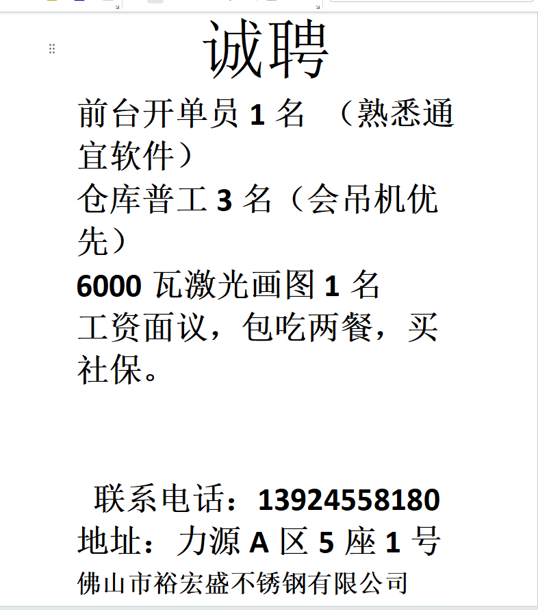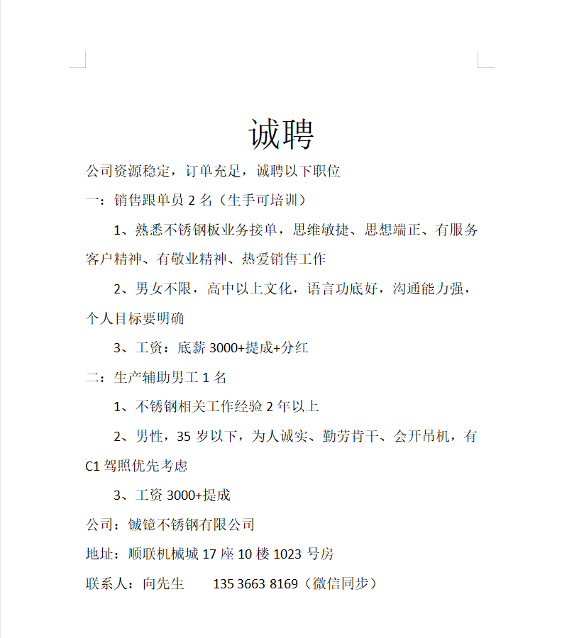 熟悉使用办公电脑,有不锈钢行业工作经验或仓库管理经验优先考虑