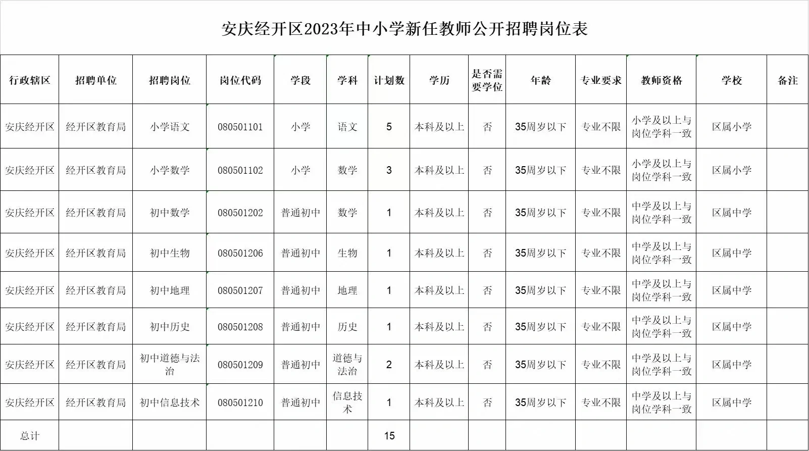 截至目前,2023年度安庆市中小学新任教师公开招聘70名。其中:市直31名、经开区15名、宜秀区12名、大观区12名。特别提醒:各个区的笔面试比例不同,请各位考生注意!