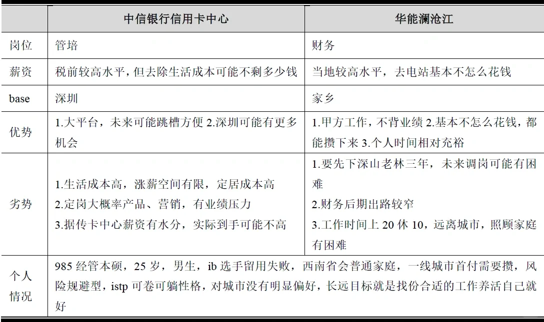 bg:985经管本硕,25岁,男生,西南省会普通家庭,一线城市首付需要攒,风险规避型,istp 可卷可躺性格,对城市没有明显偏好,长远目标就是找份合适的工作养活自己就好,有点纠结该选哪个offer[哭惹R][哭惹R][哭惹R]