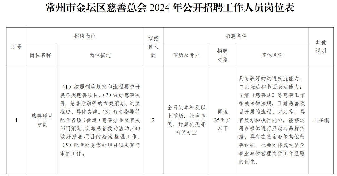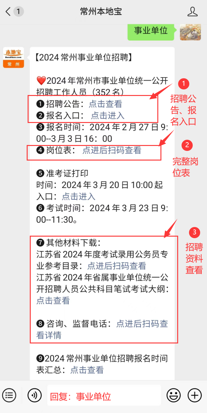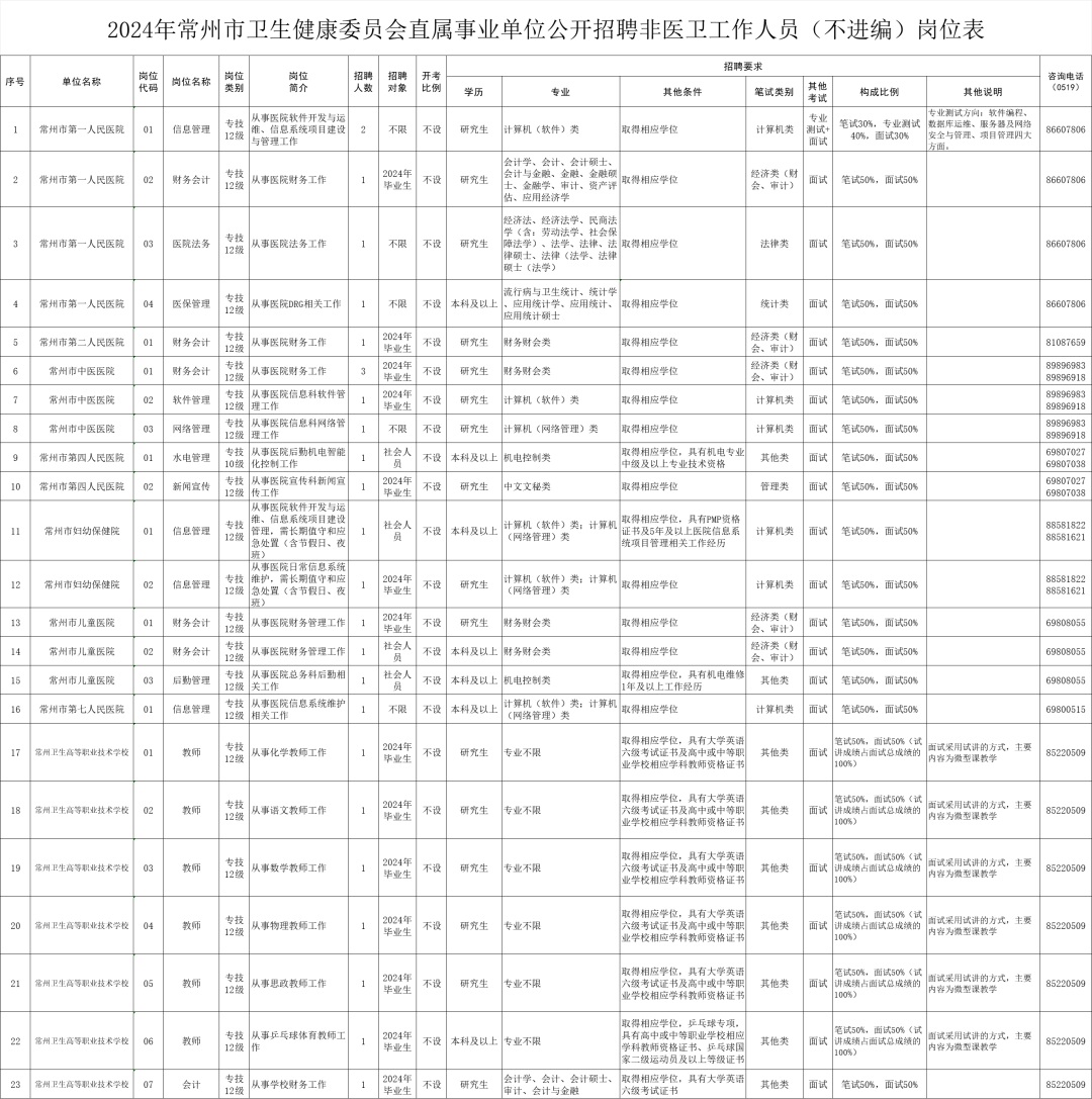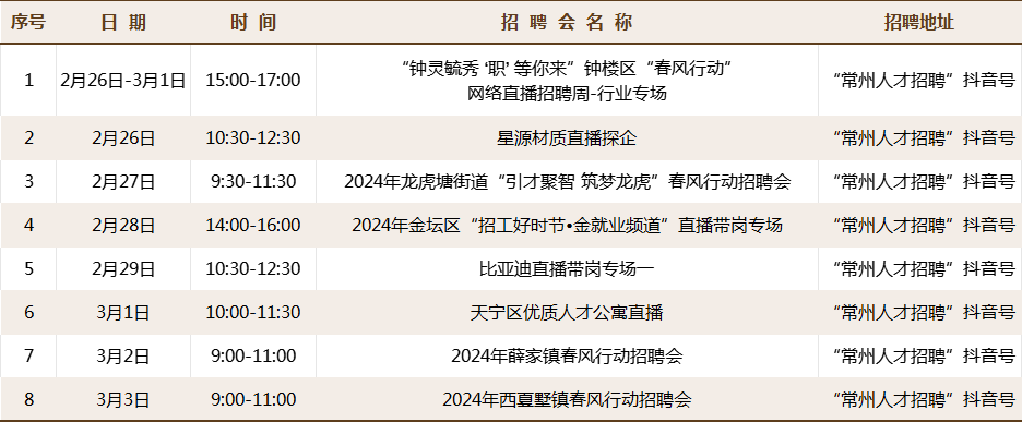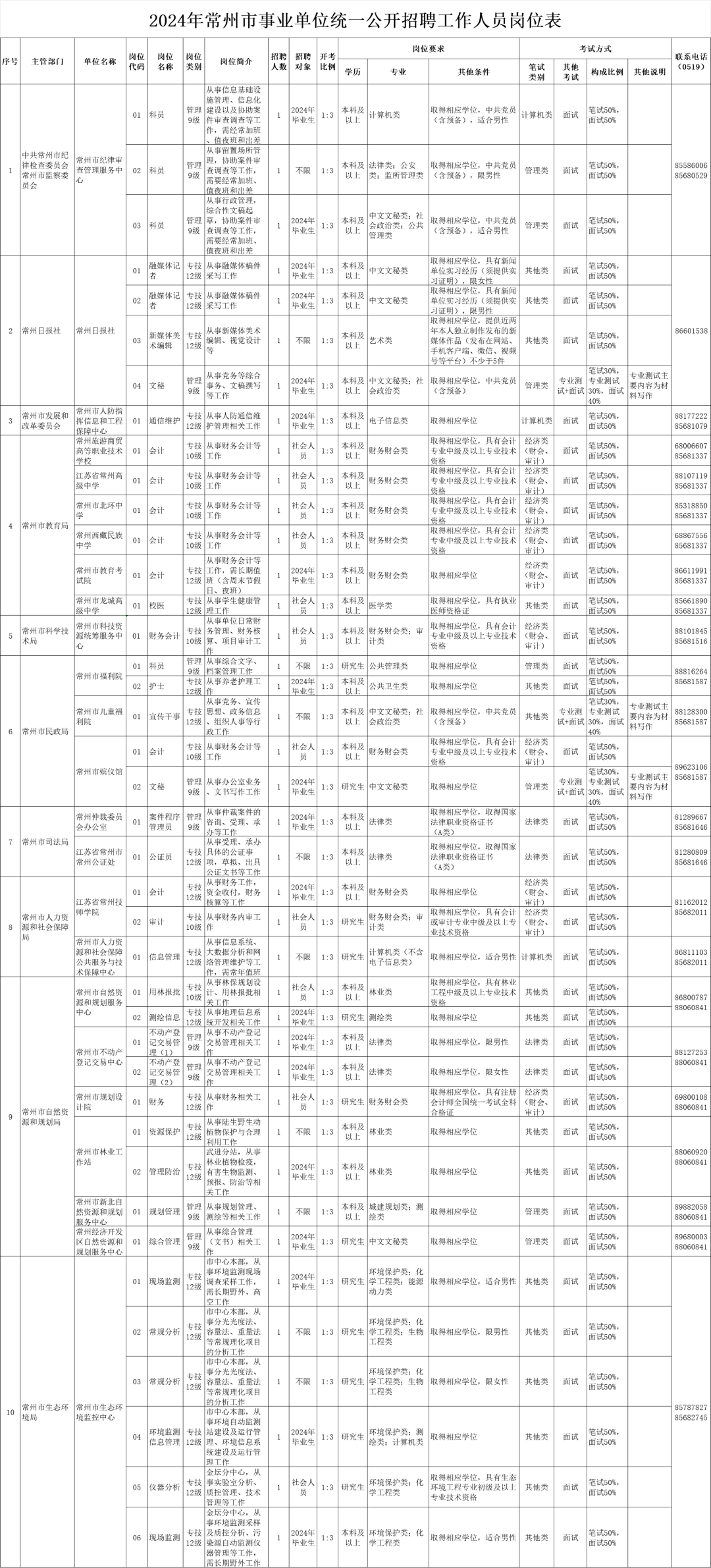 近期,不少单位都在招聘 常州朋友们不要错过以下招聘信息哦 还有周六、周末的招聘会活动 如果有家人、朋友需要找工作、换工作 也可以提前帮大家做一个参考 一起来关注~ 2024年常州市事业单位 统一公开招聘工作人员 常州市属、区属部分事业单位公开招聘352名工作人员(进编)。 一、招聘时间安排 1、报名、照片上传时间:2024年2月27日9:00--3月3日16:00。 2、资格初审时间:2024年2月27日9:00--3月4日16:00。 3、报考人员对资格初审异议的陈述申辩时间:2024年2月27日--3月5日期间的9:00--16:00。 4、资格初审单位对资格初审异议的处理时间:2024年2月27日9:00--3月6日16:00。 5、缴费确认时间:2024年2月27日9:00--3月7日12:00 招聘岗位被核减取消的报名成功人员可在2024年3月8日9:00—12:00改报其他符合条件的岗位。 二、部分岗位表: (温馨提示:可点击上下滑动、放大查看) 注:文章篇幅有限,岗位表过长,可在【常州本地宝】微信消息对话框回复“事业单位”查询详情。 三、报名方式 本次公开招聘采用网络报名方式。报名、照片上传、资格初审和缴费确认均通过网络进行。 报名入口截图 推荐了解:开始报名!2024江苏省属事业单位招聘别错过!报名入口戳→ 图源摄图网:401737815 2024年常州市事业单位招聘查询入口 点击下方名片,关注【常州本地宝】,点击发消息,在聊天对话框发送“事业单位”,即可获取2024年常州事业单位招聘/2024年江苏省属事业单位招聘完整公告、岗位表、报名入口、考试大纲、报名咨询电话、专业参考目录等信息。 2024年常州市卫生健康委员会 部分直属事业单位 公开招聘26名工作人员(不进编) 一、招聘岗位表 (温馨提示:可点击放大查看) 二、报名方式 本次公开招聘采用网络报名方式。报名、照片上传、资格初审和缴费确认均通过网络进行。 报名网址:常州市人事考试中心网 报名、照片上传时间:2024年2月27日9:00-3月3日16:00 三、招聘工作咨询电话: 1、常州市第一人民医院 0519-86607806 2、常州市第二人民医院 0519-81087659 3、常州市中医医院 0519-89896983, 89896918 4、常州市第四人民医院 0519-69807027,69807038 5、常州市妇幼保健院 0519-88581822,88581621 6、常州市儿童医院 0519-69808055 7、常州市第七人民医院 0519-69800515 8、常州卫生高等职业技术学校 0519-85220509 招聘监督电话:0519-85682570。 (温馨提示:可点击上下滑动查看) 推荐服务:关注【常州本地宝】,点击发消息,在聊天对话框发送“招聘”的关键词,即可查询2024年常州市卫生健康委员会直属事业单位公开招聘非医卫工作人员完整公告、报名入口、专业参考目录、笔试考试大纲等信息。 2024年常州市金坛区慈善总会招聘 一、招聘岗位 (温馨提示:可点击放大查看) 二、报名时间: 即日起至2024年3月15日下午5点。 三、报名方式: 报名采取网上报名方式,应聘者填写《常州市金坛区慈善总会公开招聘工作人员报名表》,并附本人身份证、毕业证、学历学位证书、学信网学历电子注册备案表或教育部留学服务中心学历(学位)认证、职业资格、工作经历等应聘岗位要求的相关证明材料扫描件。每人限报一个岗位。 慈善总会对应聘人员先进行资格审核。未提交相关资质电子证明资料的应聘人员,资格审核为不合格。 指定邮箱:914003691@qq.com 推荐服务:关注【常州本地宝】,点击发消息,在聊天对话框发送“招聘”的关键词,即可查询2024年常州市金坛区慈善总会招聘完整公告、报名表下载入口。 图源摄图网:500511158 周六、周末还有招聘会哦 需要的朋友记得及时参与 多一些机会,多一些可能 万一就找到理想的岗位了呢~ 一起来看~ 常州市人力资源服务中心招聘会 一、3月2日(周六)春风行动专场招聘会 “春风送岗,情暖龙城”春风行动专场招聘会(A馆) 1、招聘会时间 时间:上午8:30-11:30 2、招聘会联系方式 就业服务科:0519-85117255 3、招聘会地点 地点:新北区珠江路科技园五号(公交B13、10路可直达) 二、三月招聘会 (温馨提示:可点击放大查看) 图源:常州市人力资源服务中心 注:欢迎用工企业积极报名。 2024年天宁吾悦春风行动招聘会 一、举办时间 2024年3月2日-3月3日(周六、周日)10:30-17:00 二、举办单位 主办方: 常州市天宁区人力资源和社会保障局 江苏常州人力资源服务产业园管委会 常州市天宁区青龙街道办事处 承办方: 常州常天人才服务有限公司 常州市天宁吾悦广场 协办方: 常州市天宁区总工会 三、活动地点 常州市天宁吾悦广场1F大中庭(3号门进) 天宁吾悦广场:常州市天宁区东方西路与名山路交叉口东南侧 推荐查询:关注【常州本地宝】,点击发消息,在聊天对话框发送“招聘会”,即可获取2024常州招聘会更多活动内容、企业免费预定招聘会操作步骤、就在江苏智慧就业服务平台入口等信息。 图源摄图网:401769788 请近期在找工作的朋友及时了解哦 机会需要把握 小编也会持续更新常州招聘、招聘会信息 祝大家求职顺利、生活幸福~ -END-