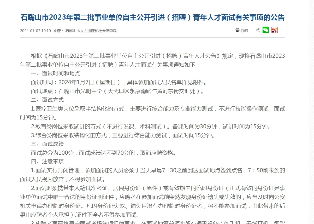 石嘴山市2023年第二批事业单位面试时间 一、面试时间和地点 面试时间:2024年1月7日(星期日),具体参加面试人员名单详见附件。 面试地点:石嘴山市光明中学(大武口区永康南路与黄河东街交汇处)。 二、面试方式 1.医疗卫生类岗位采取半结构化的方式,主要进行综合能力及专业能力测试,不进行技能操作测试。面试时间为15分钟。 2.教育类岗位采取试讲的方式(不进行说课、术科测试)。备课时间为30分钟,试讲时间为15分钟。 3.综合类岗位采取结构化的方式,主要进行综合能力测试,面试时间15分钟。 三、面试成绩 面试总分为100分,面试成绩达不到70分的,取消应聘资格。#石嘴山事业单位 #宁夏事业单位 #事业单位 #招聘 |