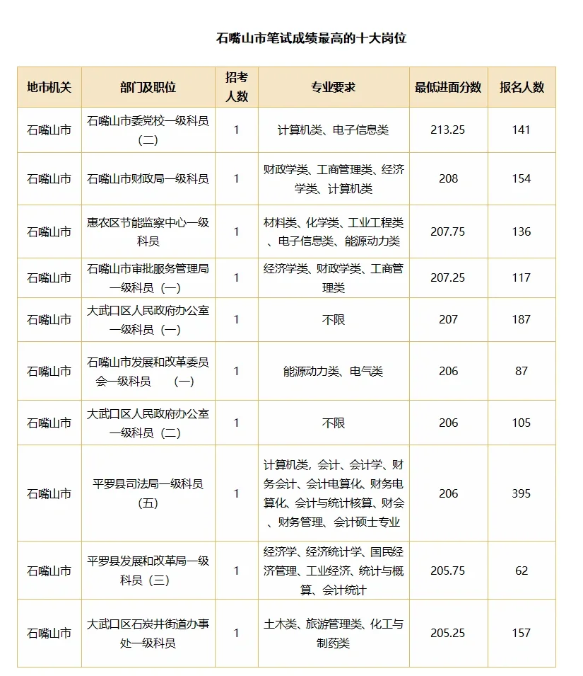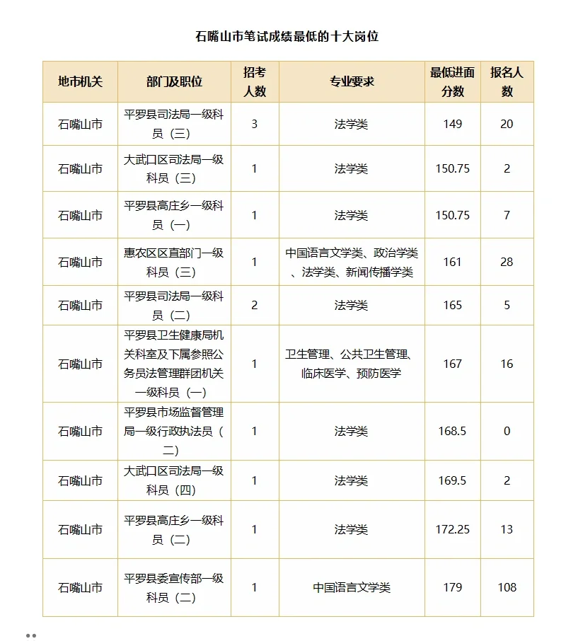 由上表我们可以看出,石嘴山市前十的笔试成绩,其中,岗位分布均匀,大部分集中在石嘴山市区。石嘴山市后十的笔试成绩中法学专业就占据了七个,且在报考人数较少的情况下进面分数任高居不下。可见石嘴山市也是高手扎堆,考生应理性报考。