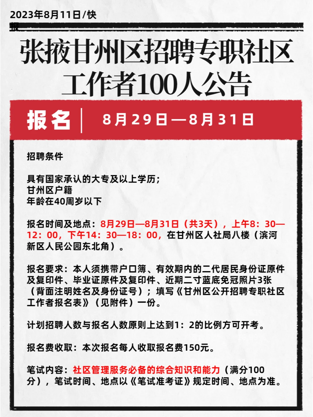 >速!张掖甘州区招聘社区工作者100人!