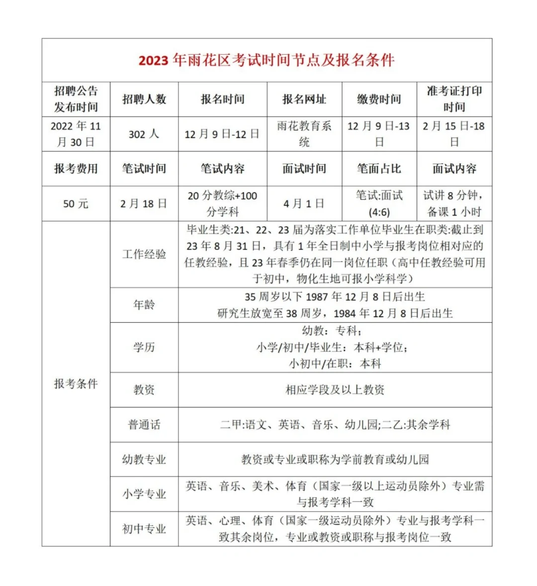 雨花区于22年11月底就发布了2023年的教师招聘公告,比往年提前了好几个月。天心区和开福区也在去年发布了招聘公告,不同的是雨花区在去年12月份就报名了,因此很多考生错过了雨花区的报名时间。