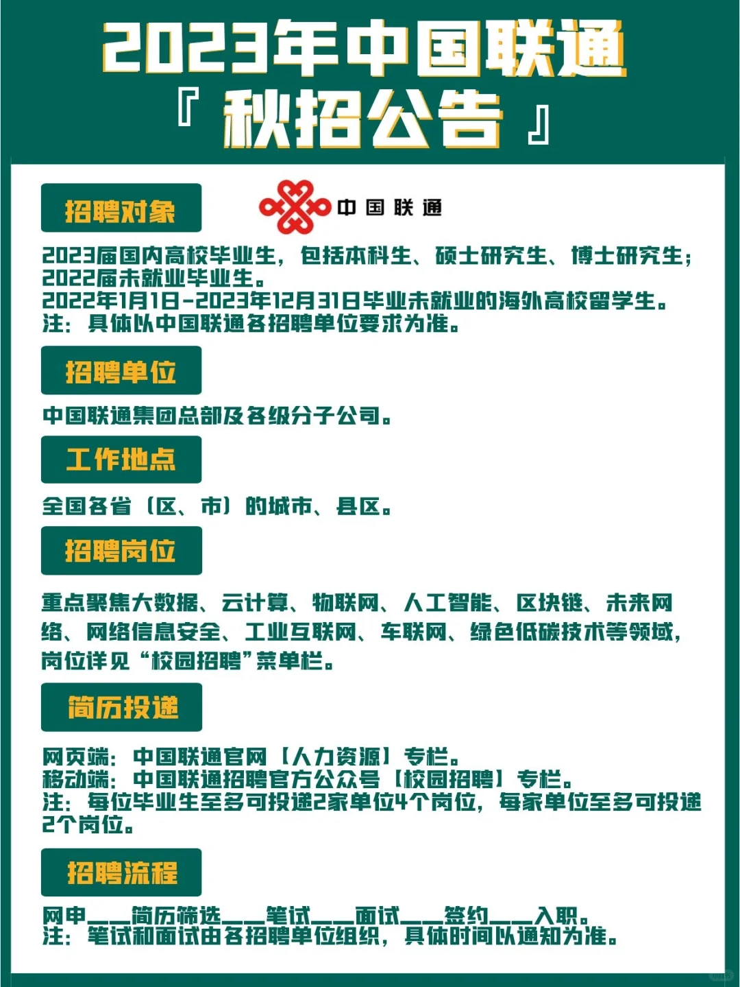 >🔥秋招!中国联通2023秋季招聘启动!